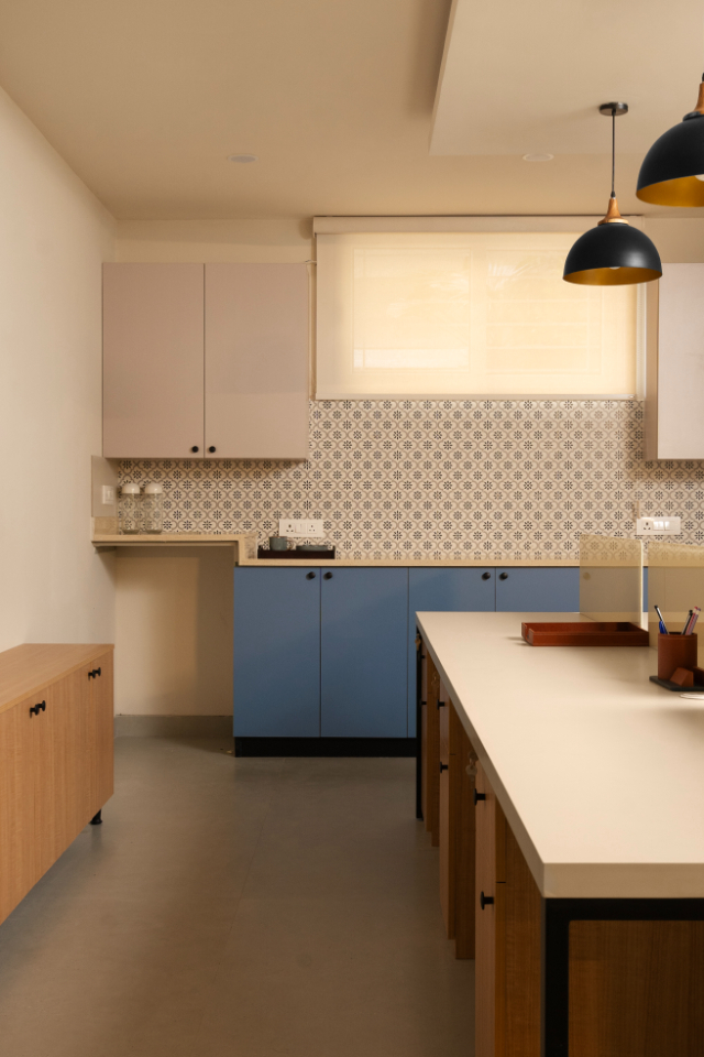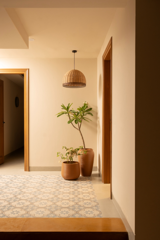 Athangudi tiles—with their vivid colors and eco-friendly craftsmanship—define the home, where striking blue tiles in the living and kitchen spaces are balanced by muted gray tiles elsewhere, creating a cohesive yet understated aesthetic.
