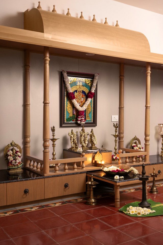 The soundproof pooja room balances practicality and serenity, with an exhaust fan providing ventilation despite no windows.
