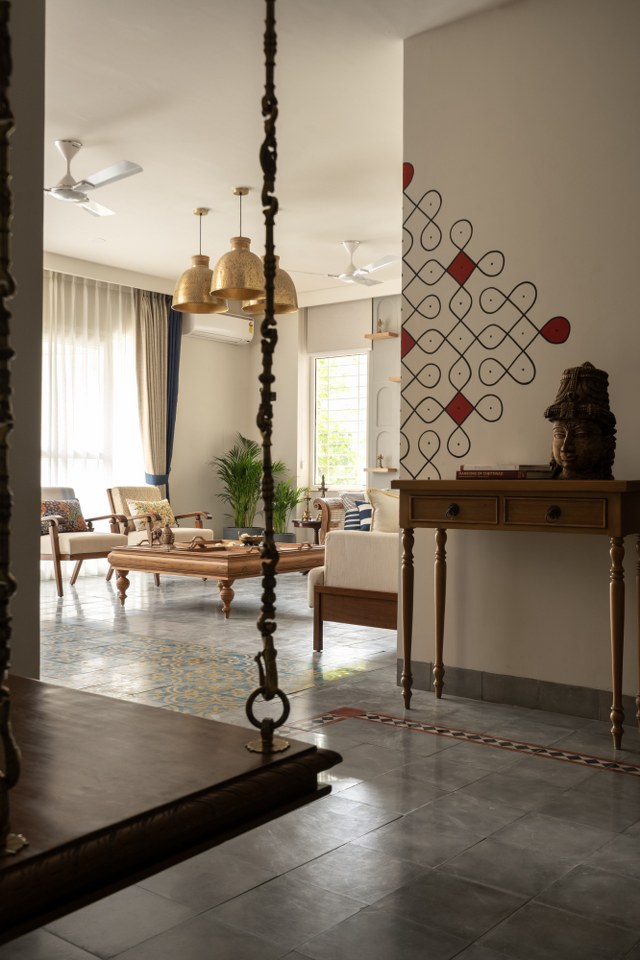 A subtle kolam mural on a corner wall connects the foyer and living room, enhancing the cultural ambiance. This thoughtful incorporation of cultural elements enriches the living space without detracting from the modern aesthetic.