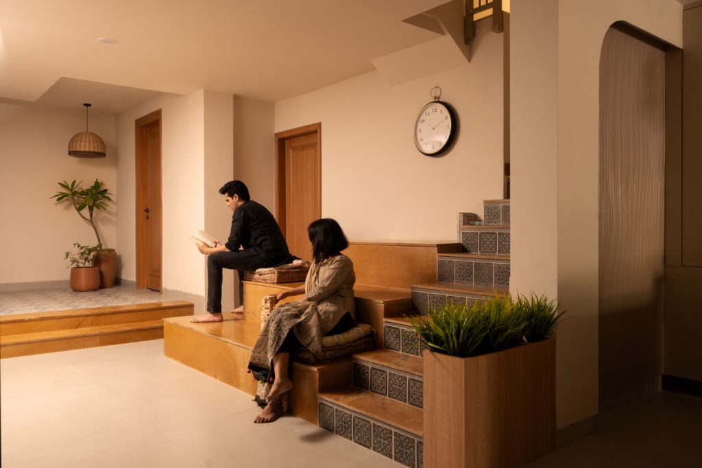 A thinne (ledge wall) offers seating and defines the space, while the Jaisalmer stone floor with brass inlays and a rangoli pattern adds cultural continuity.