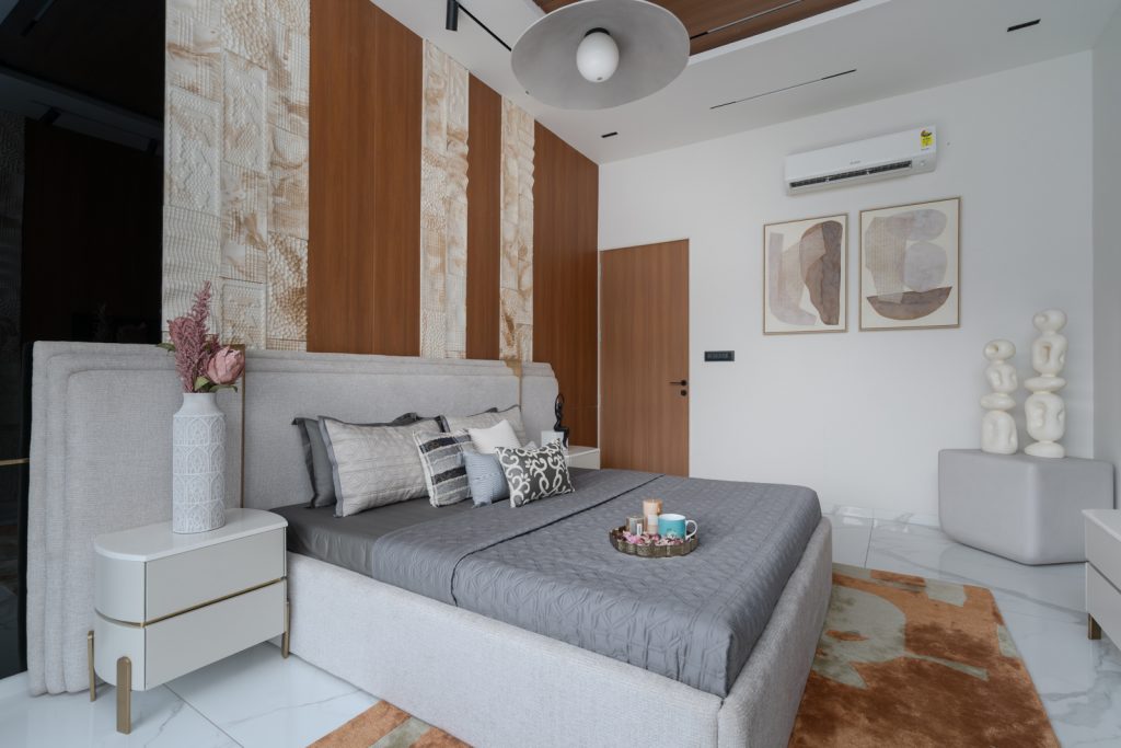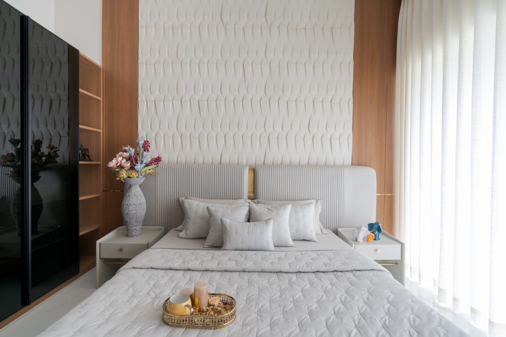This bedroom blends warmth with sophistication. A layered headboard set against wave-textured panelling creates a striking focal point, while neutral tones soften the look. Curved bedside tables with marble tops tie in elegance and utility.