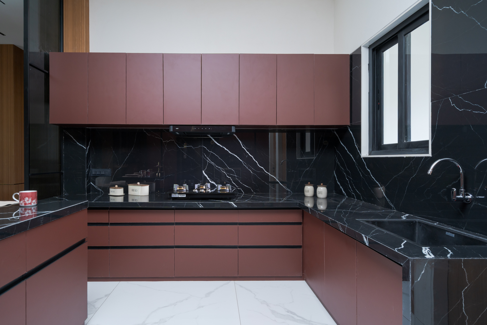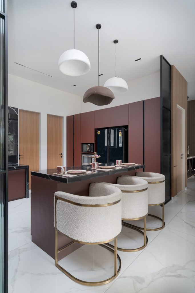 The designers designed the kitchen in a way where efficiency rules – but never at the expense of aesthetics. The deep burgundy cabinetry lends colour to the kitchen area while hiding away clutter.
