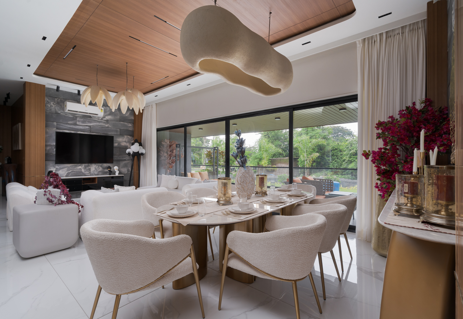 The dining zone flows seamlessly from the living space, its boundaries defined by design rather than walls. A warm stone-topped table sits beneath a pendant light that sets the stage for everything from daily meals to celebratory dinners.