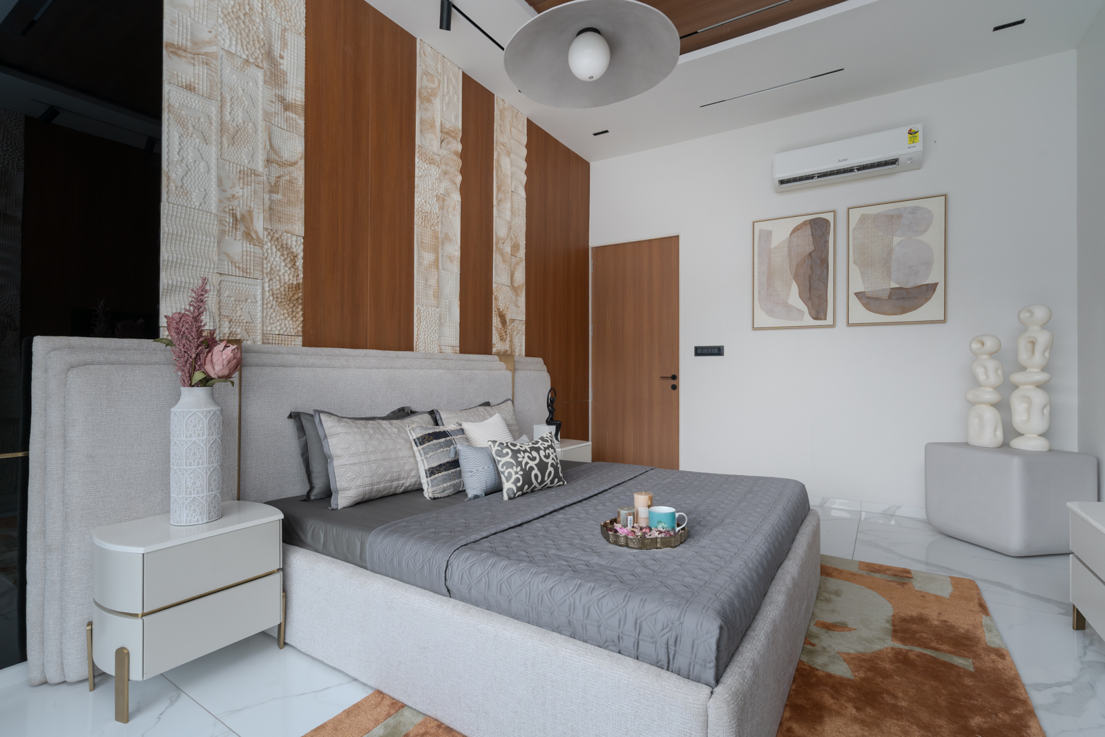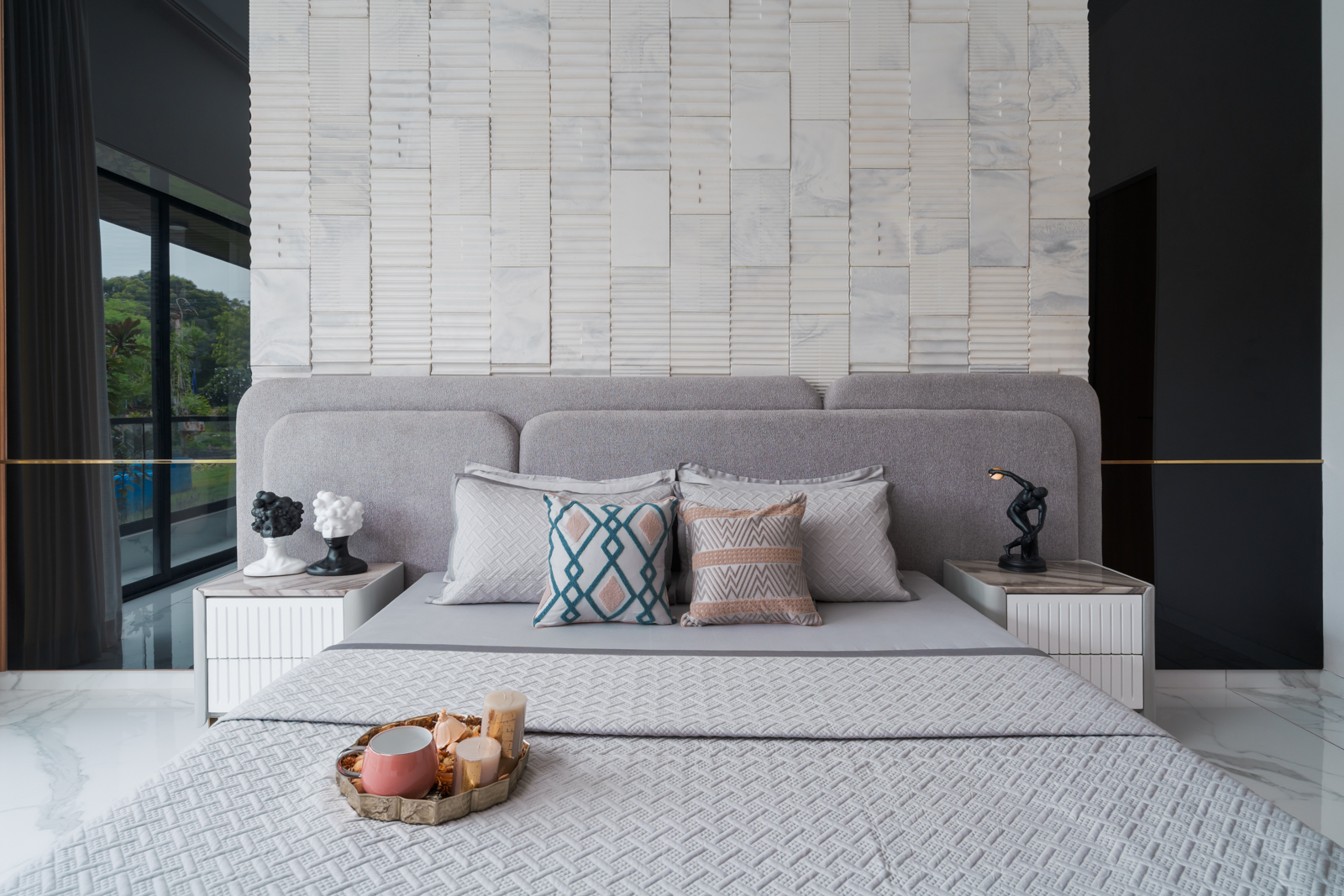 This room takes a bolder approach with accent walls that instantly commands attention. The use of panelling and flex stone creates a perfect harmony while adding character to the design. The layered headboard grounds the design, while the upholstered textures add comfort.