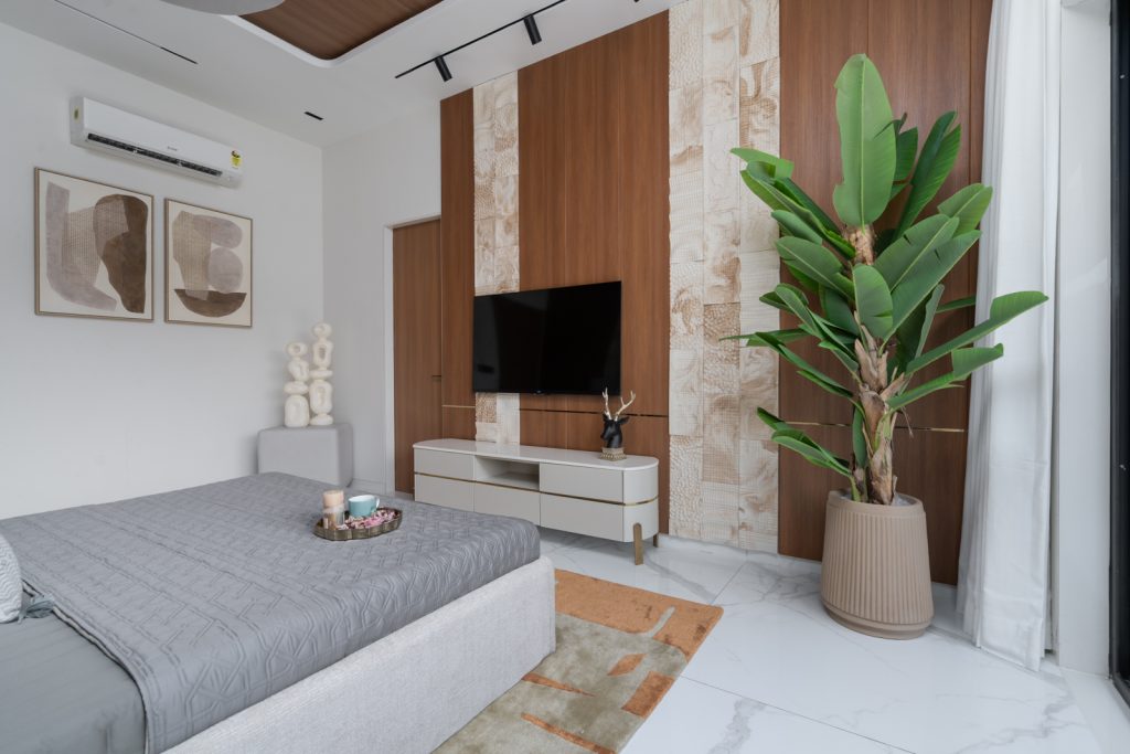 The TV unit integrates seamlessly within vertical wooden panelling, keeping the design sleek. A glossy black wardrobe adds depth and amplifies the room’s sense of space.