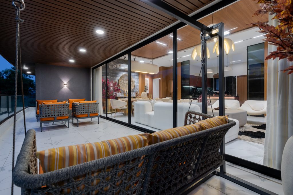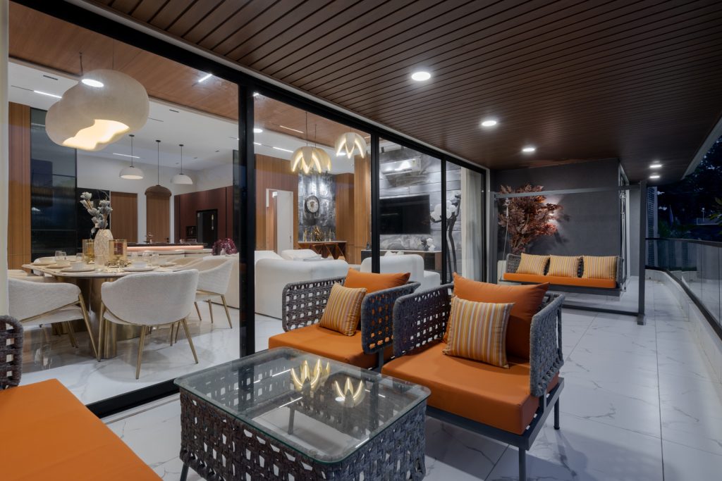 Expansive and inviting, the balcony is designed as an outdoor living room—a perfect retreat for lounging and unwinding. A swing, dressed in striped cushions, anchors one end, while woven chairs with vibrant orange upholstery add bursts of energy against the neutral flooring and ceiling.