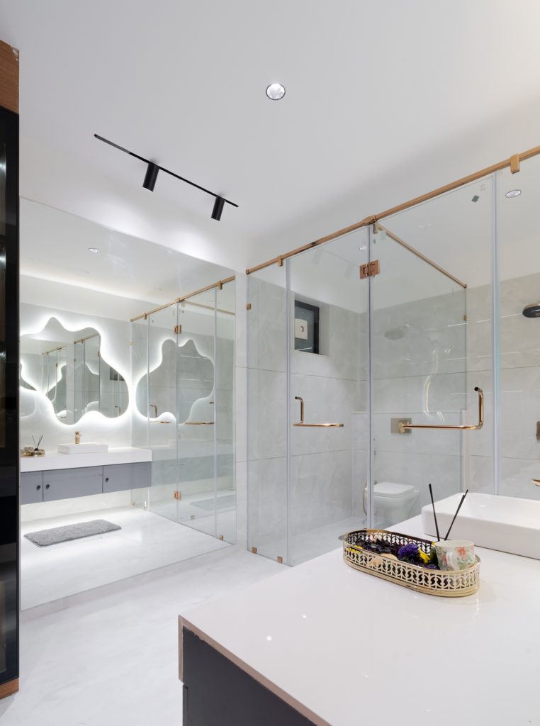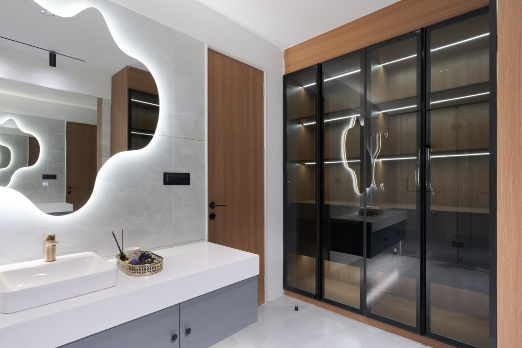 Every fixture has been chosen for both sleekness and utility, turning daily routines into indulgent rituals. The fluted glass wardrobe with backlighting offers ease of storage and adds grace to the otherwise pristine while space.
