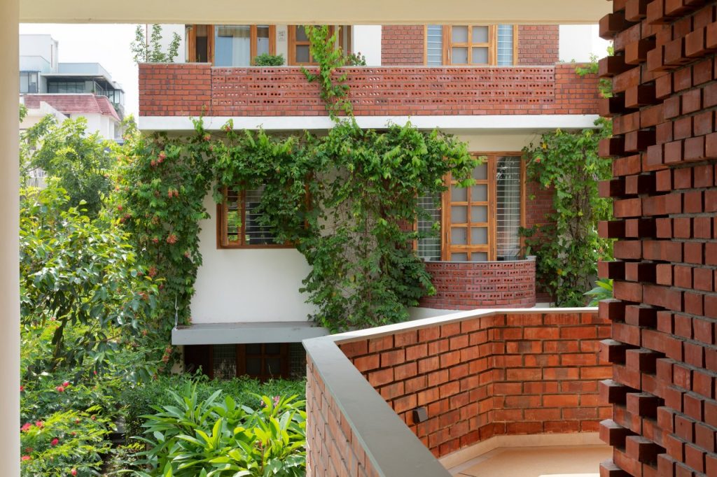 Responding to Jaipur’s climate, the south façade is kept blank to block harsh sunlight, articulated instead with expressive brickwork. Cross-ventilation and daylighting strategies maintain comfort, while tensile shading at the staircase balances privacy with climatic performance.