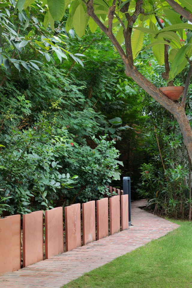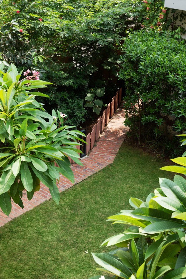 The garden, connecting both residence and homestay, is the project’s living heart. Ornamental trees, flowering shrubs, fruit-bearing plants, and climbers fill the site with scent and shade. The east-facing façade rises as a backdrop for this greenery, carrying fragrant climbers up to the second floor, so that the building itself becomes an extension of the garden.