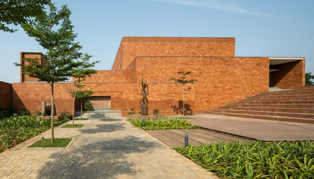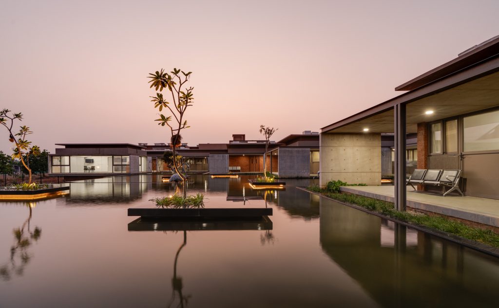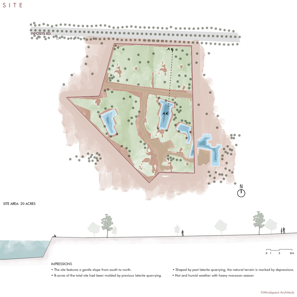 The natural terrain is marked by depressions and a gentle slope. It is respectfully embraced within a 20-acre site shaped by past laterite quarrying. These depressions have been reimagined as rainwater harvesting ponds, reflecting a harmonious integration of landscape and architecture.
