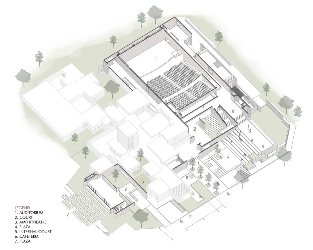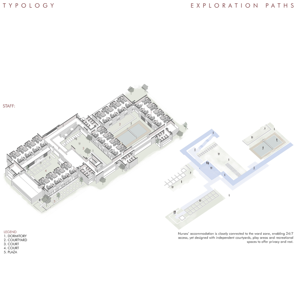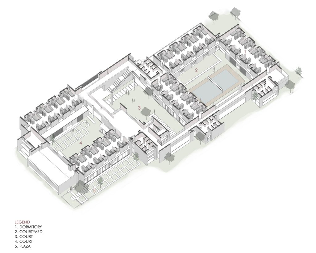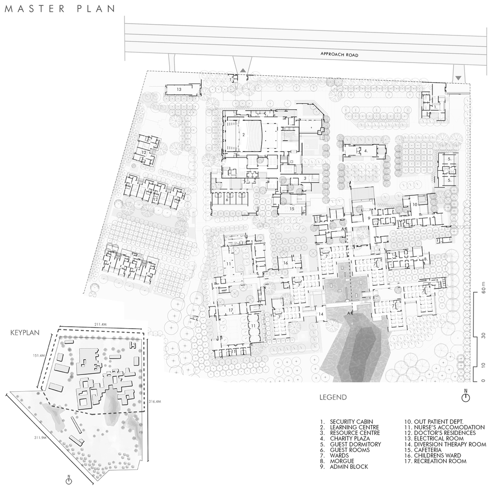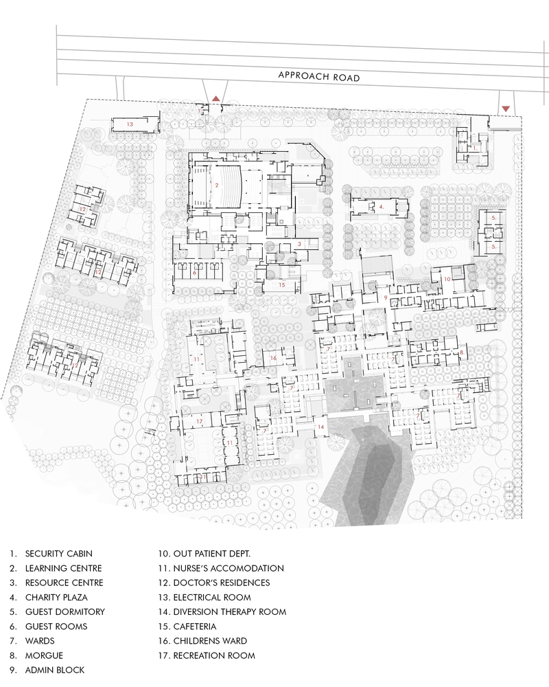 Nursing accommodations are located in close proximity to the wards for immediate access, yet feature their own courtyards and recreational areas to offer personal space and respite. The Learning Center and 500-seater Auditorium, placed at the campus edge, feature low-rise structures grouped around courtyards to promote focused, peaceful learning. The auditorium’s blank sculptural façade contrasts the porous quality of other structures, with a forecourt plaza serving as a social gathering space.