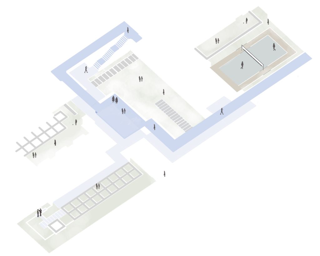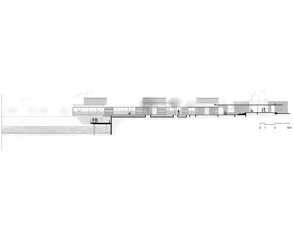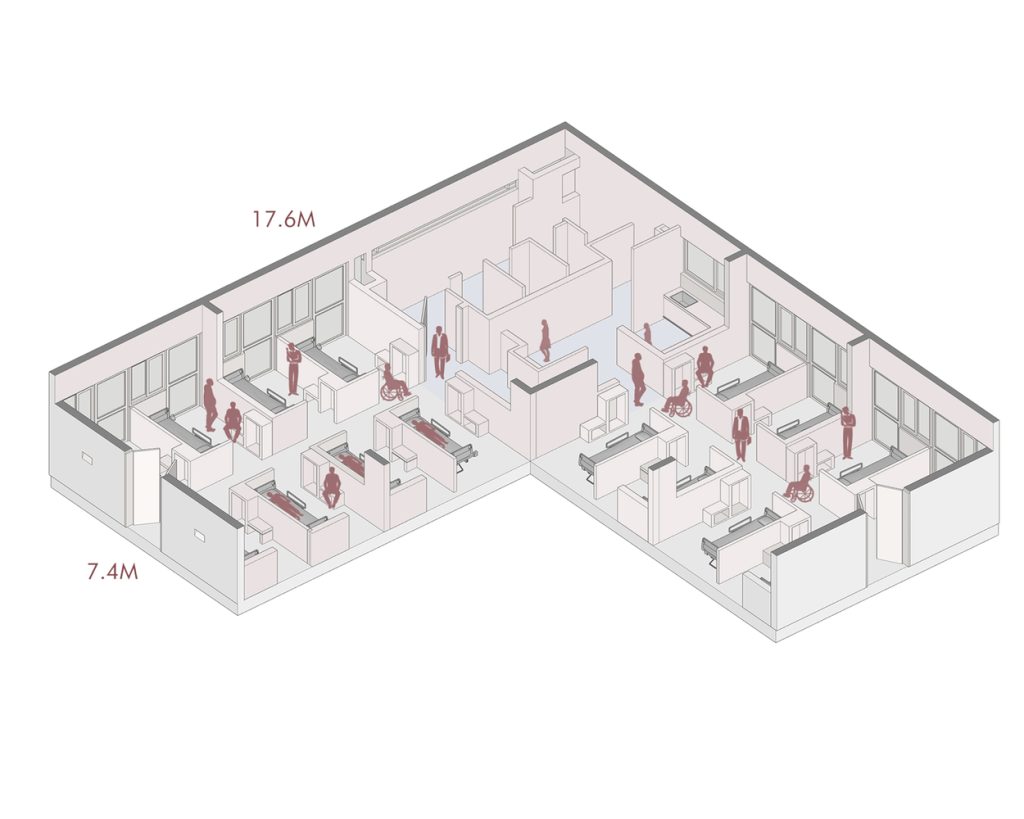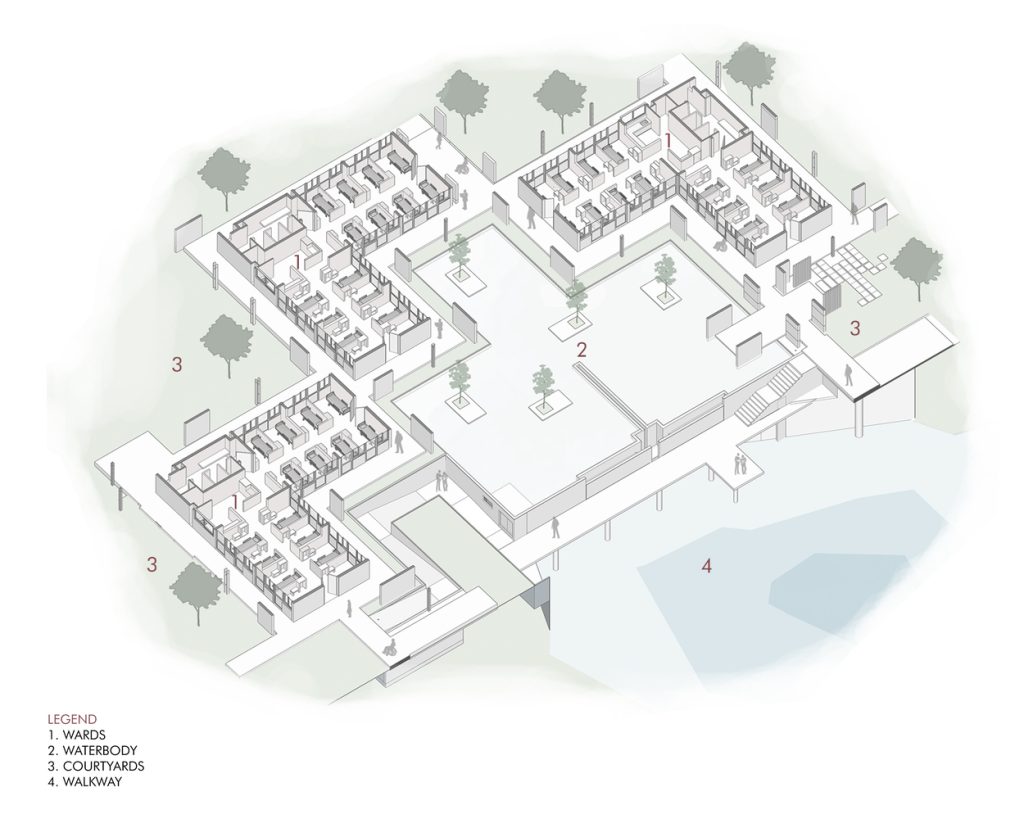 At the heart of the hospice lie 6 L-shaped in-patient wards, each accommodating 16 beds. They arranged these around a serene water body, transforming the quarry’s edge into a calm, reflective focal point. Corner nurse stations ensure full visibility of patients, while wide verandas act as transitional zones for counseling, family meetings, or quiet solitude.