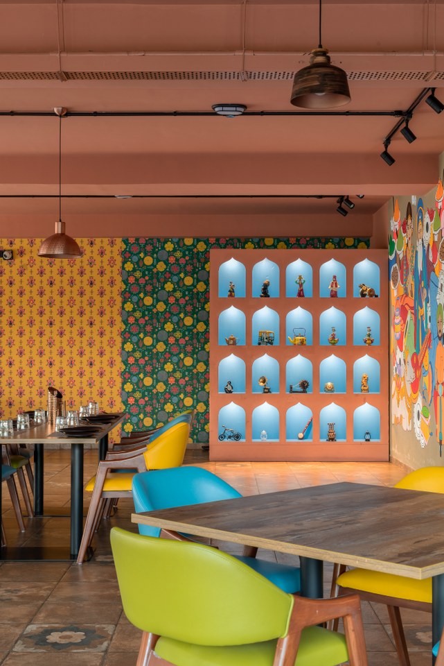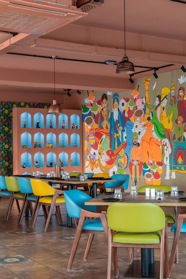 Functionality was as important as aesthetics. The seating arrangement strategically blends communal tables for large groups with cozy nooks for intimate dining experiences. The open-plan layout with bright coloured tapestry ensures a lively, bustling environment, much like a traditional Punjabi eatery.