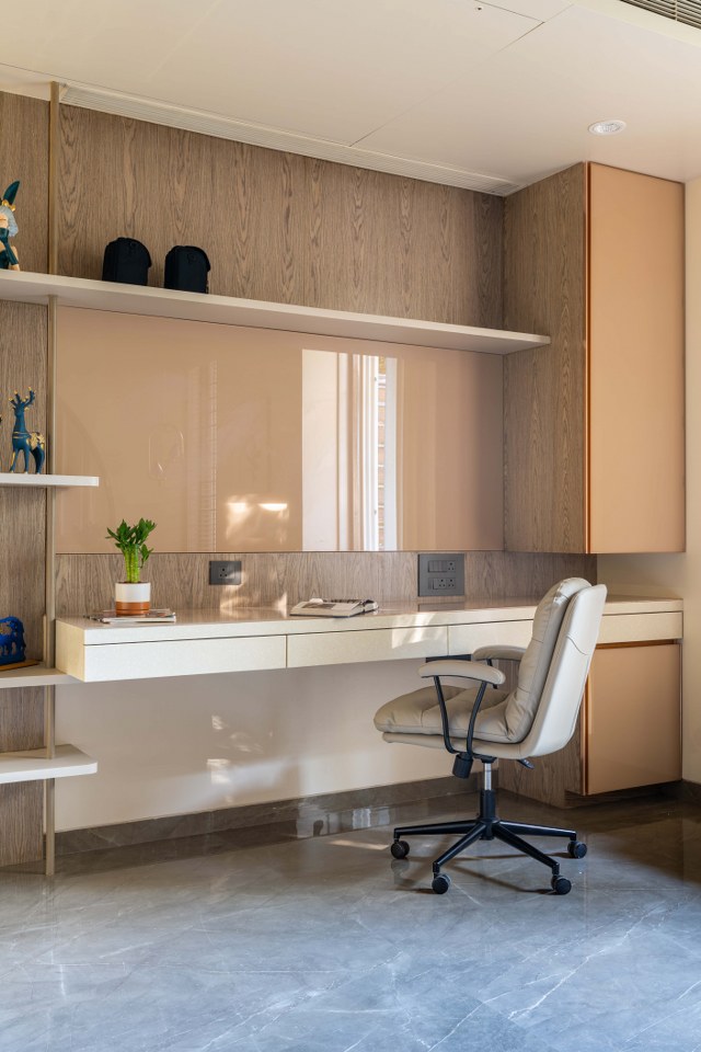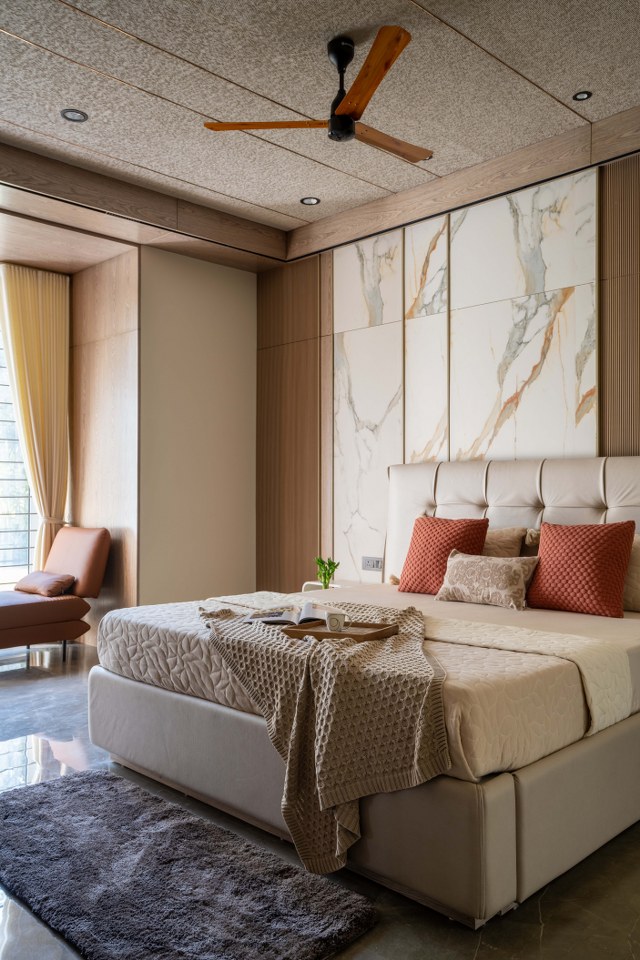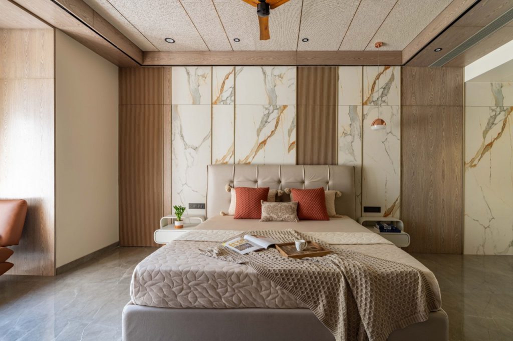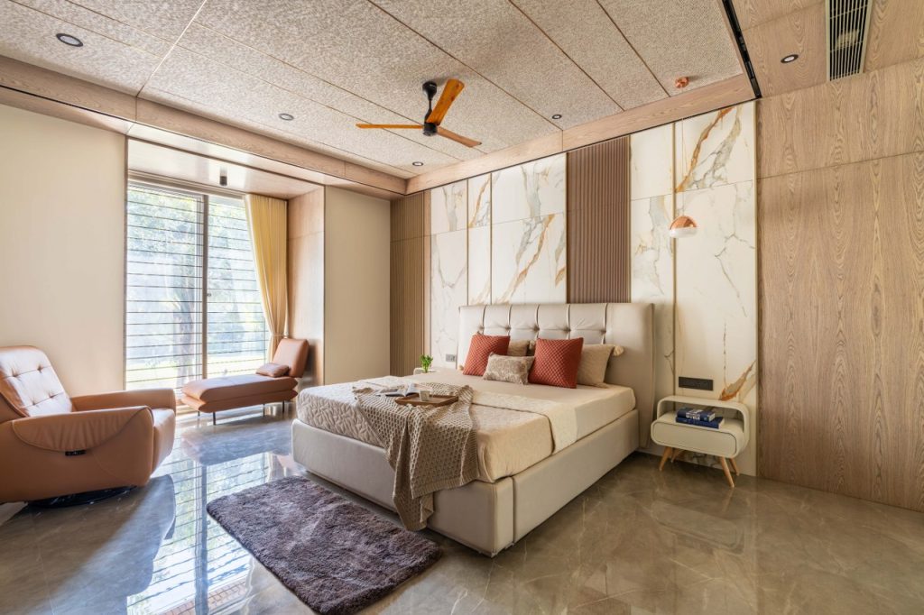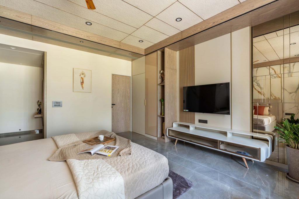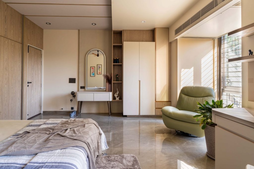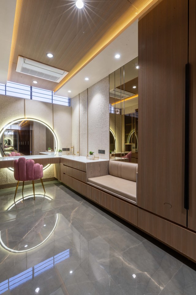 The master suite on the first floor is especially striking, with a 31-ft-long walk-in wardrobe, marble-accented backdrops, and refined material play.
