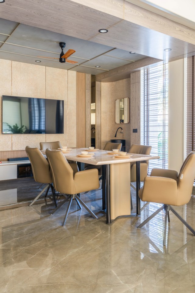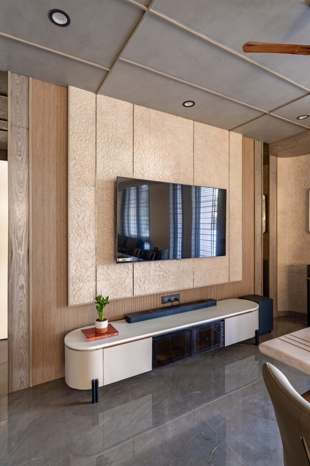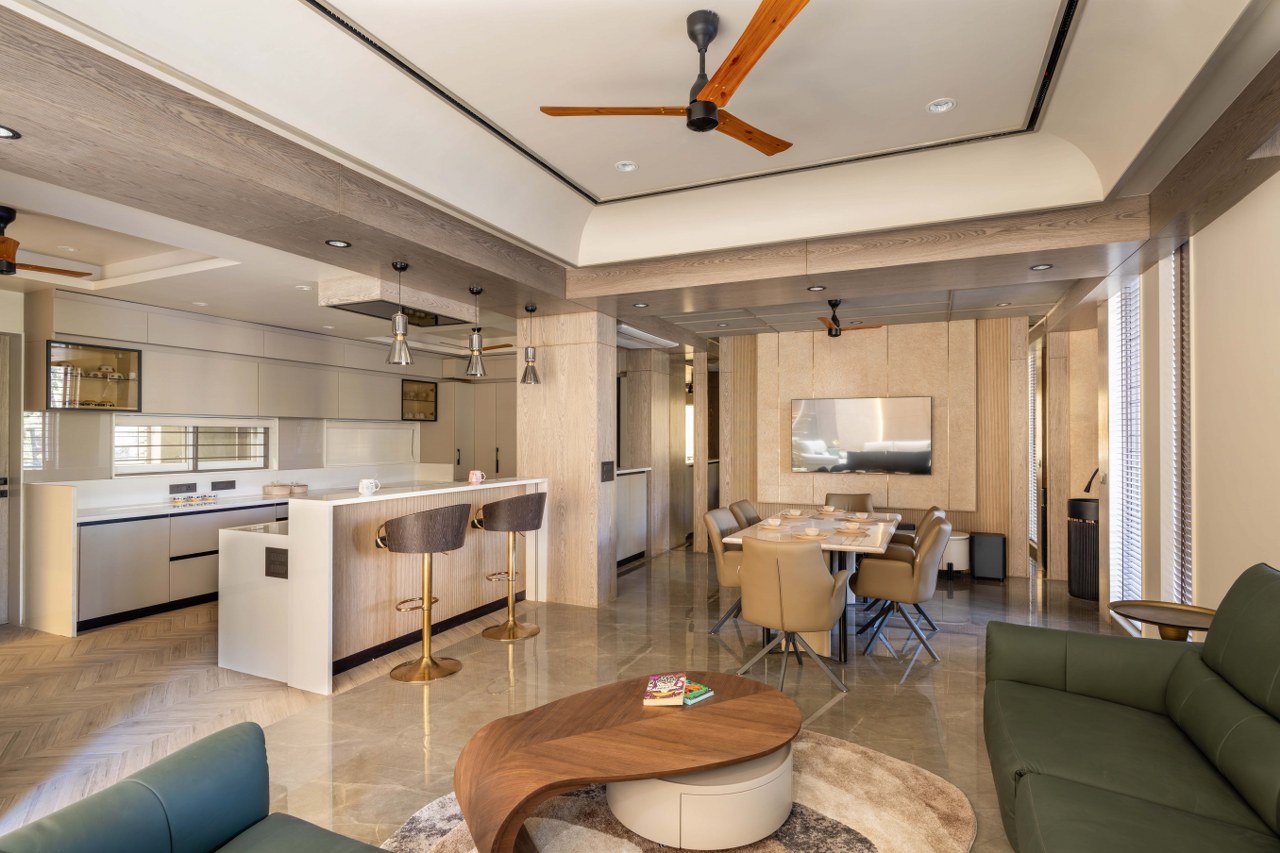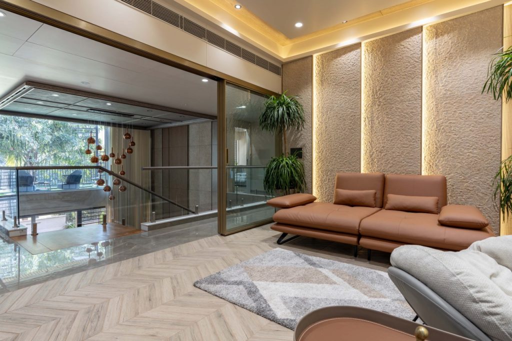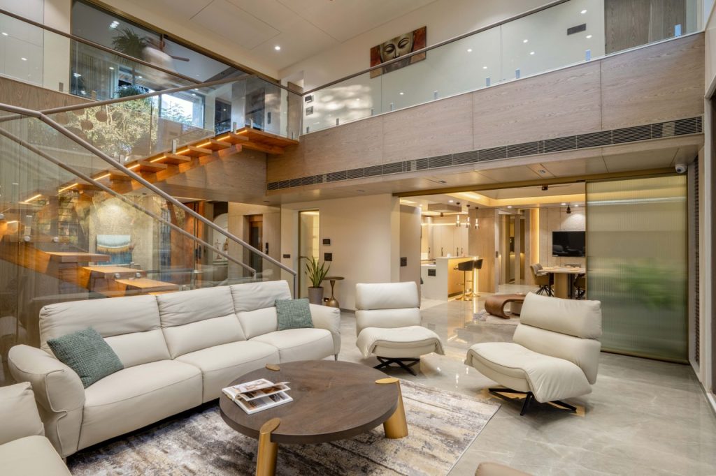 Inside, the double-height drawing room makes a grand impression with its teakwood veneer and textured backdrop, elegant Italian leather seating, and artful lighting.