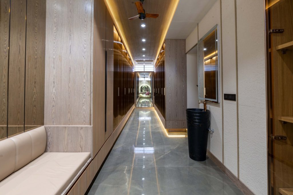 The entrance of this luxurious residence sets the tone with a warm PVC wooden ceiling and bold corten steel elements. This includes the main doors and nameplate, all tied together by a rich palette of MCM cladding, veneer, and fluted panels.
