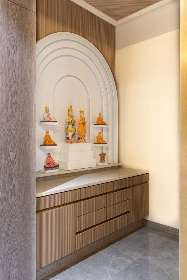 An olive green sofa adds vibrancy, while fluted glass doors provide privacy between the public and family zones. The puja room stands as a tranquil retreat with intricate CNC-cut detailing and spiritual elegance.