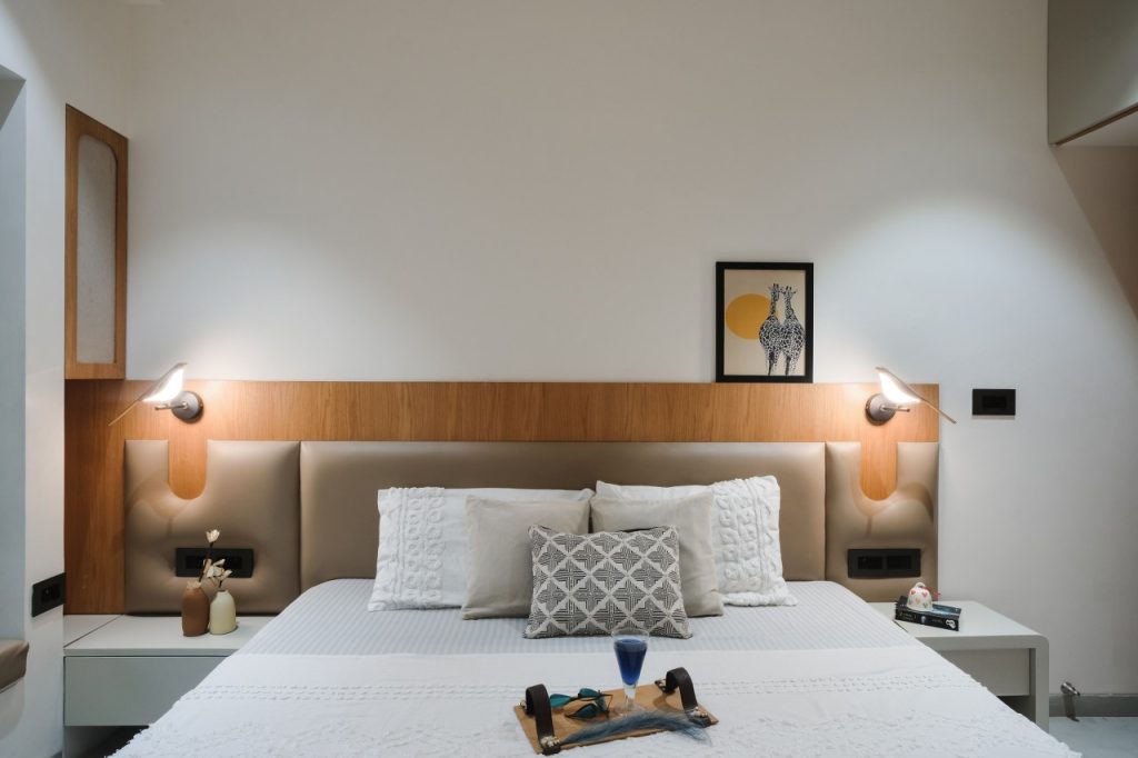In the Master bedroom, the centerpiece is a plush, upholstered bed with veneer paneled door, offering both comfort and elegance.