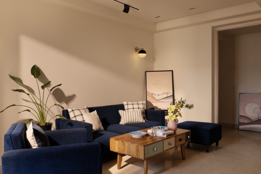 This minimalist home blends calm, simplicity with ethnic charm, reflecting the clients’ serene approach to life. Their design preference was clear: nothing fancy, just a space that feels peaceful, comforting, and functional. The minimalist house interior design embraces a soft and neutral color palette, with soothing beige and whites creating a calm atmosphere. However, the drawing room stands out as a space where vibrant hues are welcome. Shades of blue pop across the room, injecting energy and character, creating a lively environment.