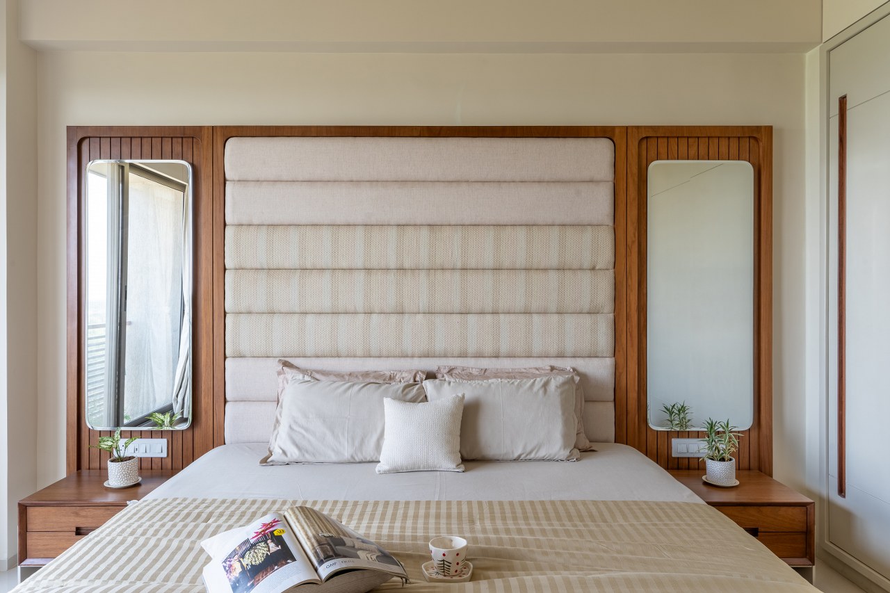 This room embodies tranquility through a monochromatic, neutral color palette. A full-height upholstered headboard in textured beige fabric becomes the main focal point, flanked by tall vertical mirrors set within teak-finish frames visually elongating the wall while enhancing ambient lighting.