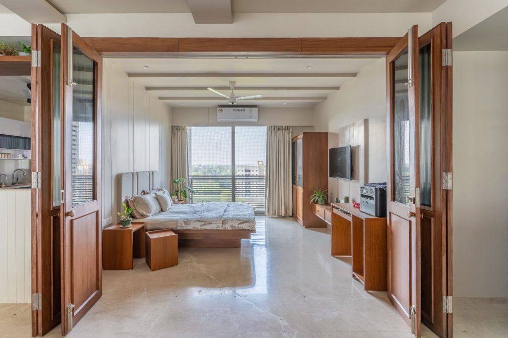 Folding wooden doors allow this room to serve as a guest bedroom, study, or extension of the living area depending on the need. Potted plants and soft beige furnishings keep the atmosphere light and calming.