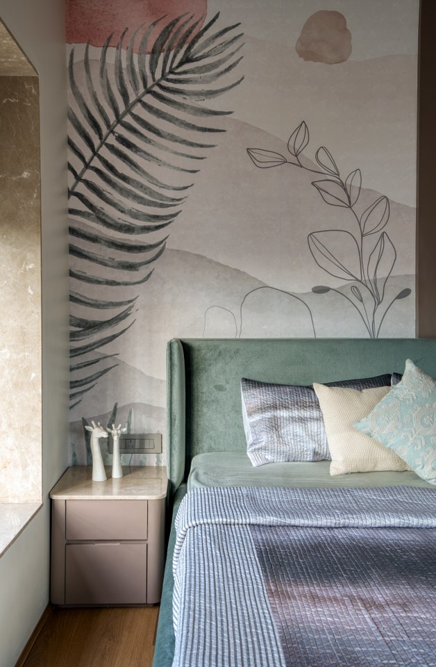 Soft, elegant, and soothing — this blush-toned bedroom pairs a velvet bed with a dreamy bamboo mural backdrop. Thoughtful lighting and earthy accents complete the calm, contemporary vibe.