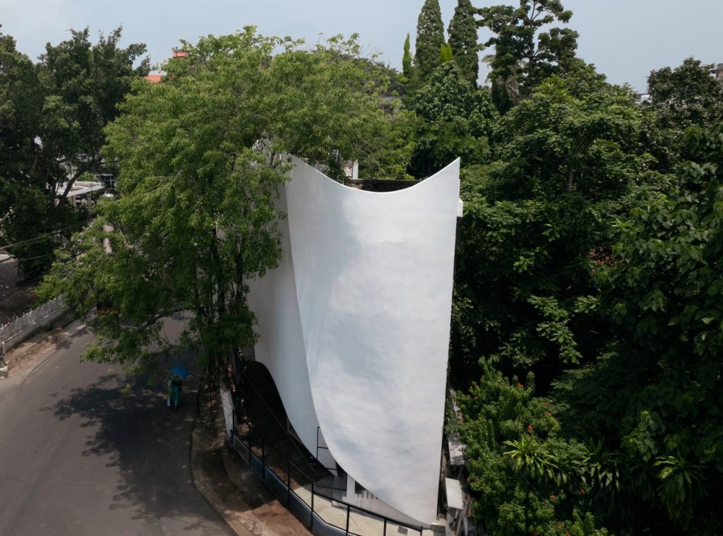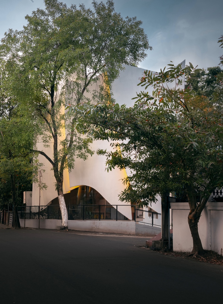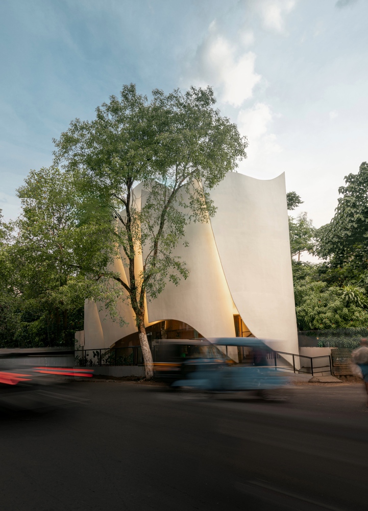 “The project responds with creativity, not compromise, on just 76.4 sq.m (1.96 cents) of irregular land—an urban leftover that people would typically dismiss. “Rather than imposing a rigid geometry, the design flows: a curving, cast-in-place concrete shell that embraces constraints and transforms them into sculptural possibilities.