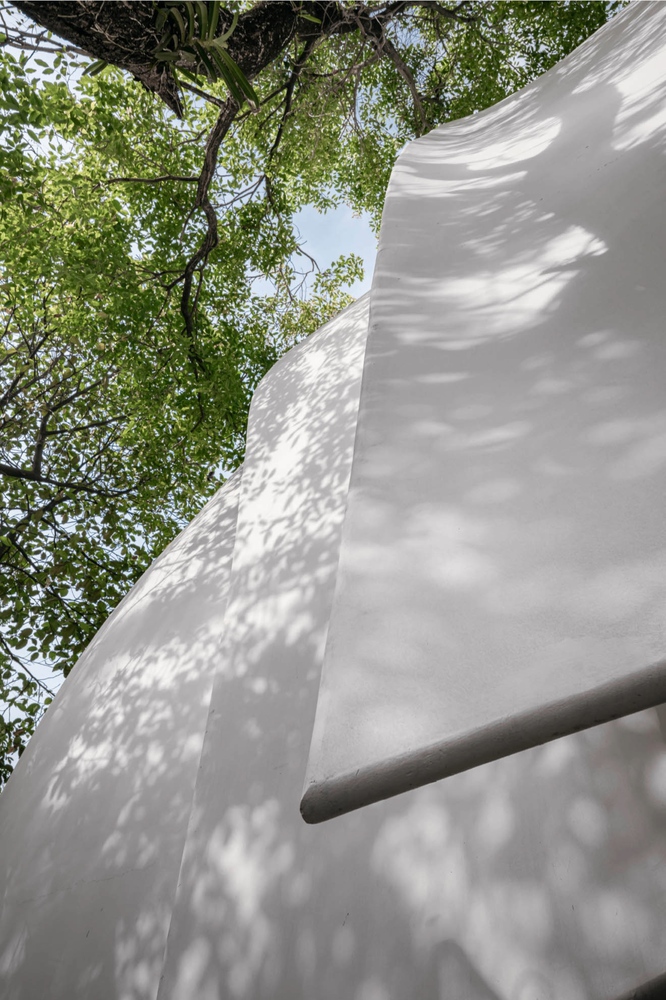 The white, petal-like concrete blades of the façade act as both enclosure and expression. Sculptural and light-catching, they soften the building’s interface with the street while wrapping around the site’s existing trees. The play of curves not only negotiates the fragmented plot but also introduces warmth, rhythm, and identity to an otherwise nondescript urban corner. At night, the folds glow gently with embedded lighting, making the building a symbolic and literal beacon of care in the neighborhood.