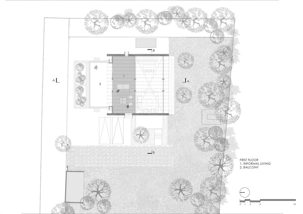 dramatic double-height living and dining space anchors the plan, receiving daylight from multiple directions. This central space becomes the social heart of the home, fostering connection while remaining closely tied to nature. The inclusion of a jack-arch roof, a traditional construction technique rarely used in contemporary homes, adds both character and volume, enhancing passive cooling while introducing a sense of spatial drama and craft.