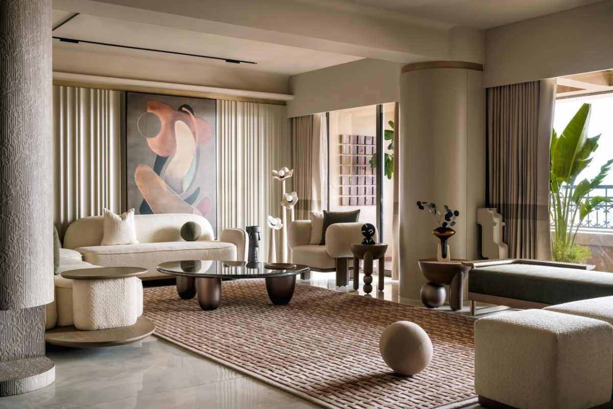 Several pieces, such as a rattan and timber bar unit and a TV console crafted from the same materials, were collaboratively designed. We also conceived certain statement pieces, including the living room coffee table and the study table in the multipurpose room. Our decorative light fixtures were sourced from companies like Oorjaa, known for their work with natural materials such as banana fiber paper, and Lampshaper, which crafts exquisite pieces from brass and alabaster. All these lights are meticulously handmade by skilled artisans.