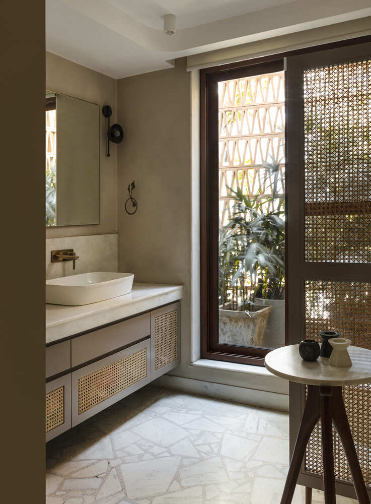 Our selection of materials, both external and internal, prioritized locally available natural options whenever possible. Indian limestone was chosen for the flooring, with a rough finish for exterior areas and a polished one indoors. Bathrooms feature Indian marble for shower enclosures, countertops, and flooring, complemented by the subtle elegance of micro-concrete for dry area walls. The kitchen boasts a shot-blasted basalt floor, handmade tiles for the walls, and Indian granite for the counters.