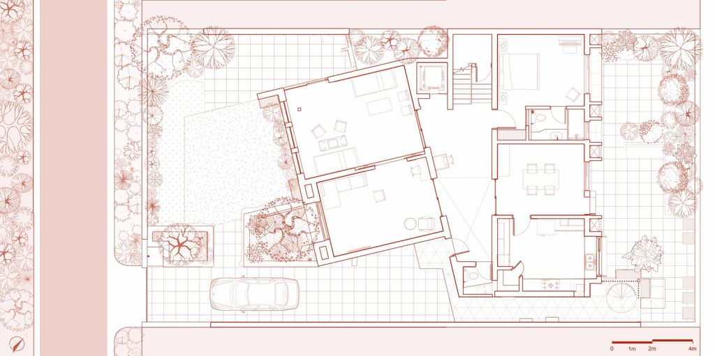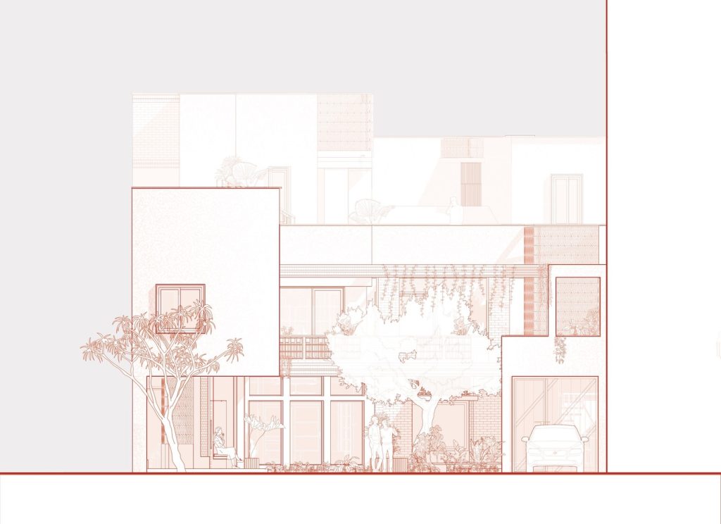 To define the courtyard, we extended the existing geometries of the renovated house to the permissible front setback. The result was a stepped courtyard, featuring gardens at ground level and terraces on the upper floors. The designers bounded this open-ended courtyard on the western edge by a one-and-a-half-story volume, beneath which lies a serene verandah. To the east, extended terraces with planters cover the driveway and a carport below. They positioned the main house to the north, and framed the south by trees and the adjacent park. All these spaces now benefit from the intimate internal views of the courtyard, alongside expansive vistas of the park.