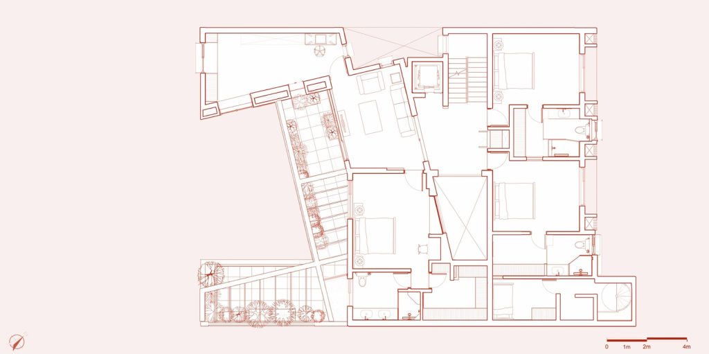 While preserving the house’s original shell proved immensely valuable for environmental conservation, we completely overhauled its internal systems. New electrical and plumbing lines were installed, and a more efficient VRV system for HVAC was integrated. In line with our commitment to conservation, photovoltaic panels were added, along with solar water heaters linked to a heat pump system for hot water needs. All rainwater discharge from the terraces is directed to a recharge pit. To future-proof the house, an elevator was also incorporated.