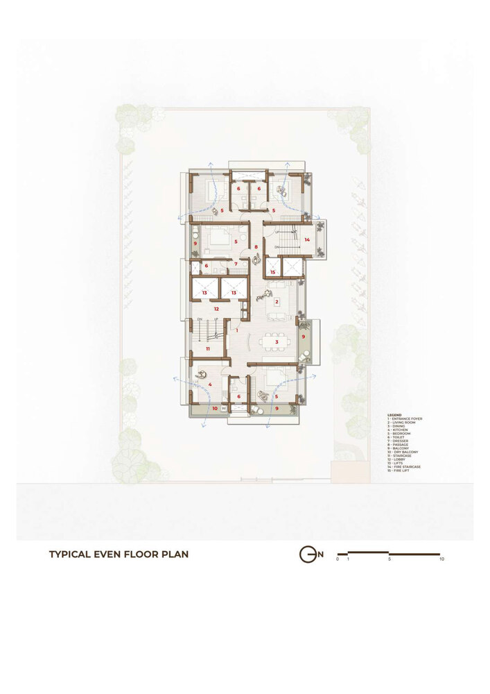Taking cognizance of this climate, each of the main rooms in this residential building opens into 2 balcony spaces, one open and one screened. This helps to reduce heat gain substantially, simultaneously providing sheltered open spaces to each room.