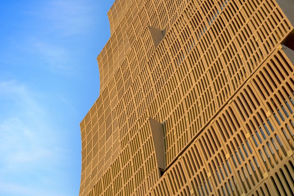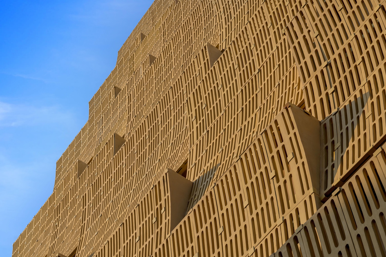 The architect designed the screened bays as sectional curves, forming a screen at the lower level and curving outwards to form a balcony at the upper level. These sectionally curved screens alternate horizontally and vertically across the building, providing protection from heat, forming green open spaces for each room, and lending a sculptural quality to the building. These screens allude to the architectural heritage of the region, where screens have existed since the 17th century.