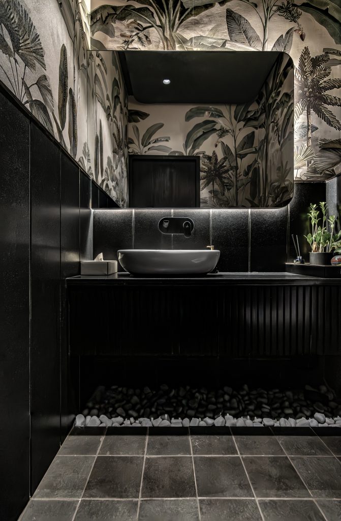 Mangroove adopts a restrained yet layered material palette, reinforcing the project’s ethos of quiet luxury. A monochrome palette dominates the interior, receding into the background to foreground the collections. This deliberate neutrality ensures that fashion remains the protagonist, while architecture operates as a supporting framework. Dark tiled flooring grounds the space, offering visual weight and durability appropriate for a high-traffic retail environment. The design introduces pebbled insets within the surface, adding textural moments that subtly reference natural terrain. Concealed lighting within these insets creates the illusion of levitating fixtures, introducing moments of visual intrigue that reward close observation.