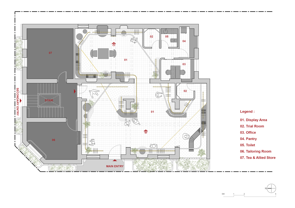 Back-of-house elements—including tailoring, office, pantry, and storage—are efficiently integrated into the layout. These essential service areas remain discreet and unobtrusive, ensuring operational clarity without disrupting the experiential narrative of the retail floor. The seamless integration of function and form reflects a mature design approach, where efficiency supports, rather than compromises, spatial quality.