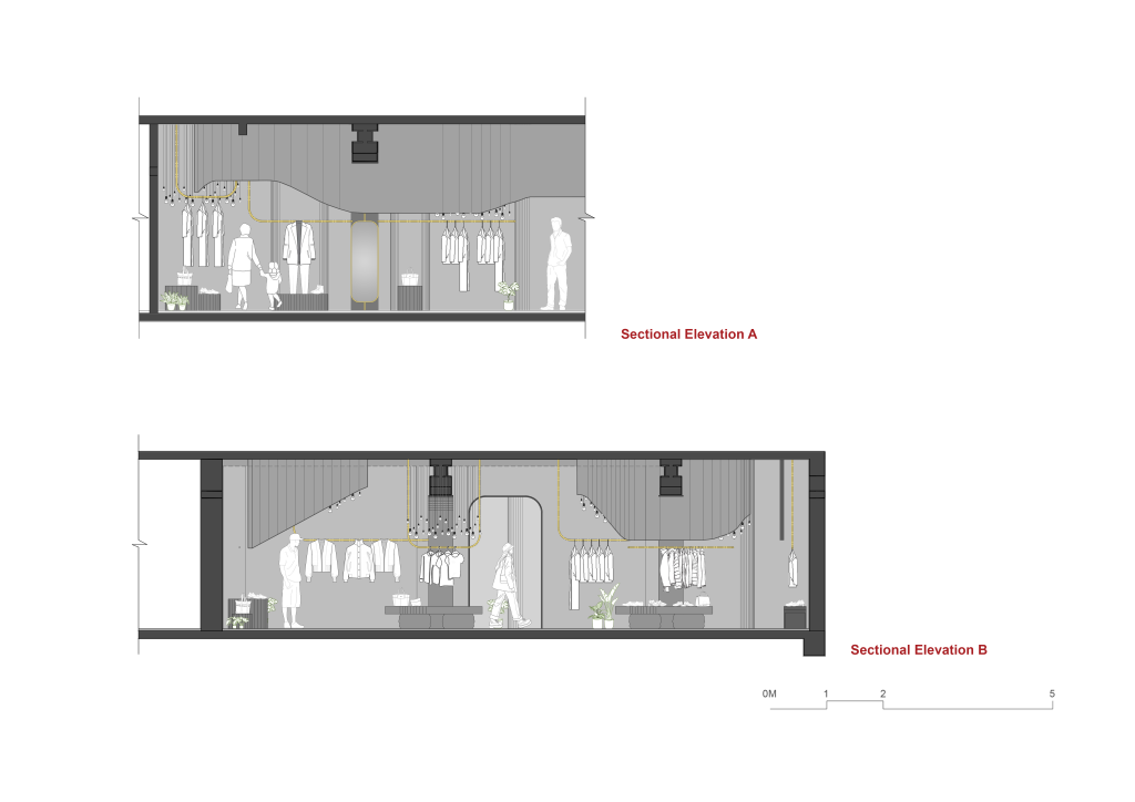 Brass rails, used for hanging garments, trace the curved geometries of the plan. These elements subtly delineate retail zones without fragmenting the space, reinforcing continuity while introducing a fine layer of material richness. Their reflective quality interacts gently with light, adding depth without visual excess