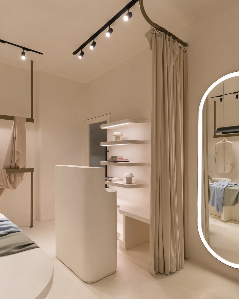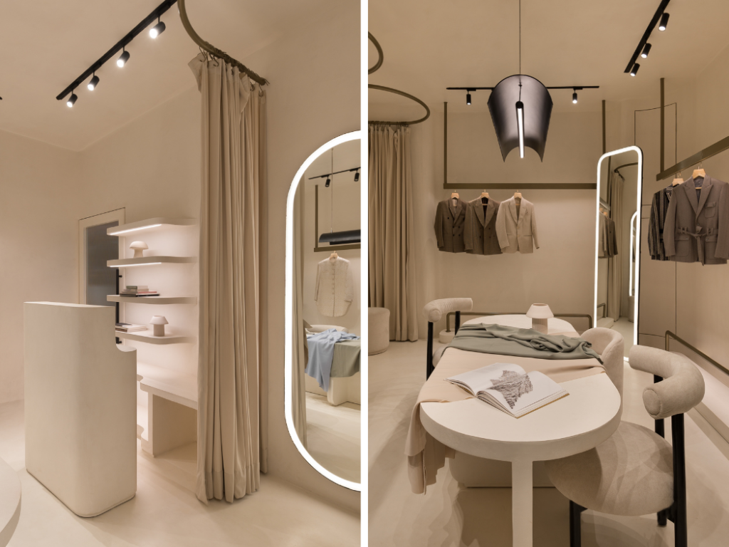 The design narrative unfolded with a focus on restraint and clarity. The designers carefully chose a subdued material palette to evoke a sense of understated elegance. They wrapped the entire space in a seamless, light beige concrete micro-topping—from floor to wall—creating a neutral yet warm canvas that allows the garments to take center stage.Curved walls and custom furniture with softened edges introduce a sense of fluidity, creating a cocoon-like environment that feels both intimate and expansive.