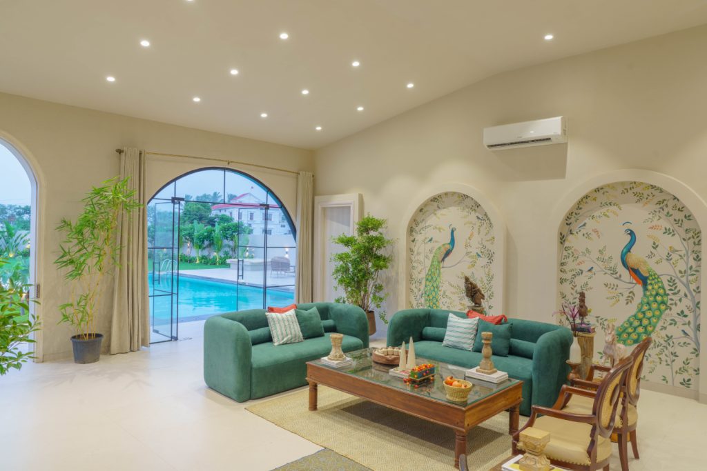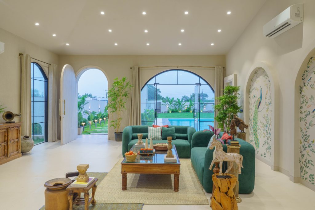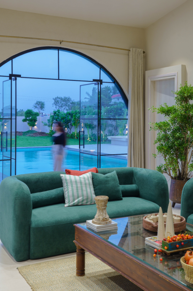 The heart of the farmhouse is warm and inviting. Beautiful green sofas paired with rattan chairs bring in comfort and texture, while a single-piece wooden center table grounds the space with raw elegance.