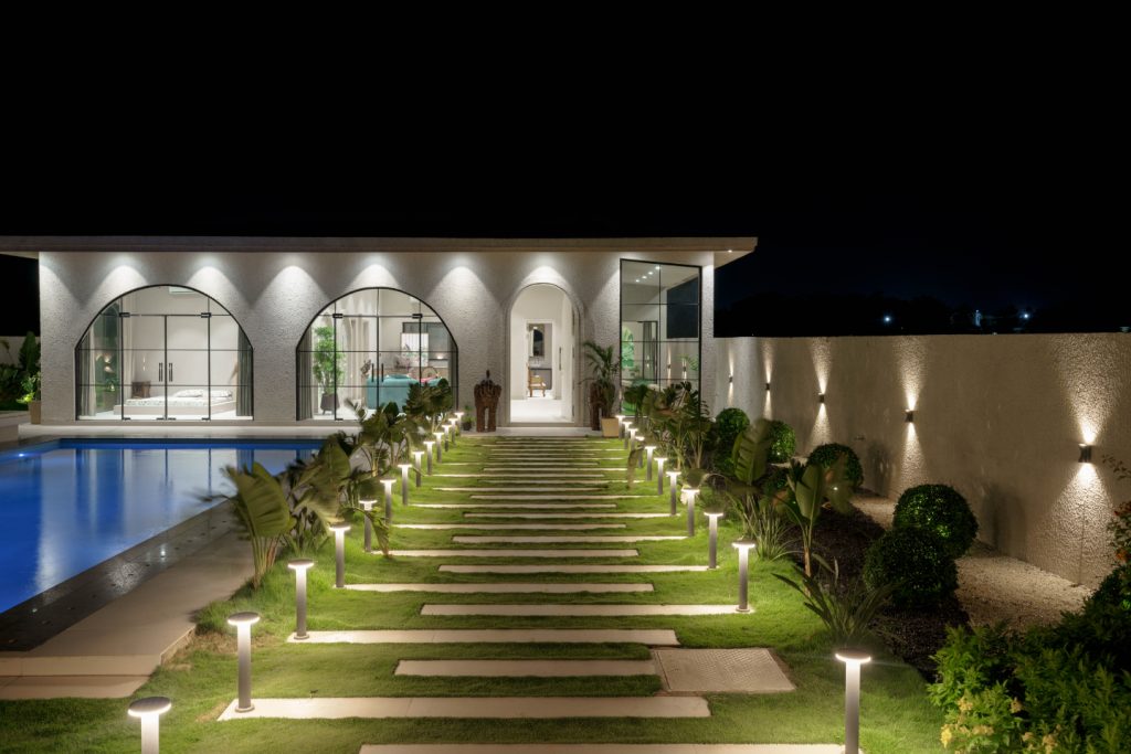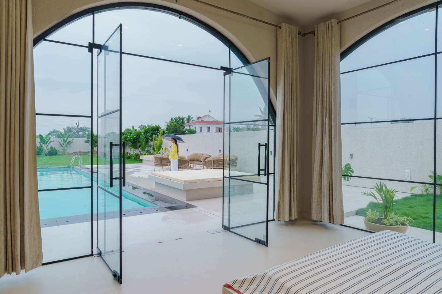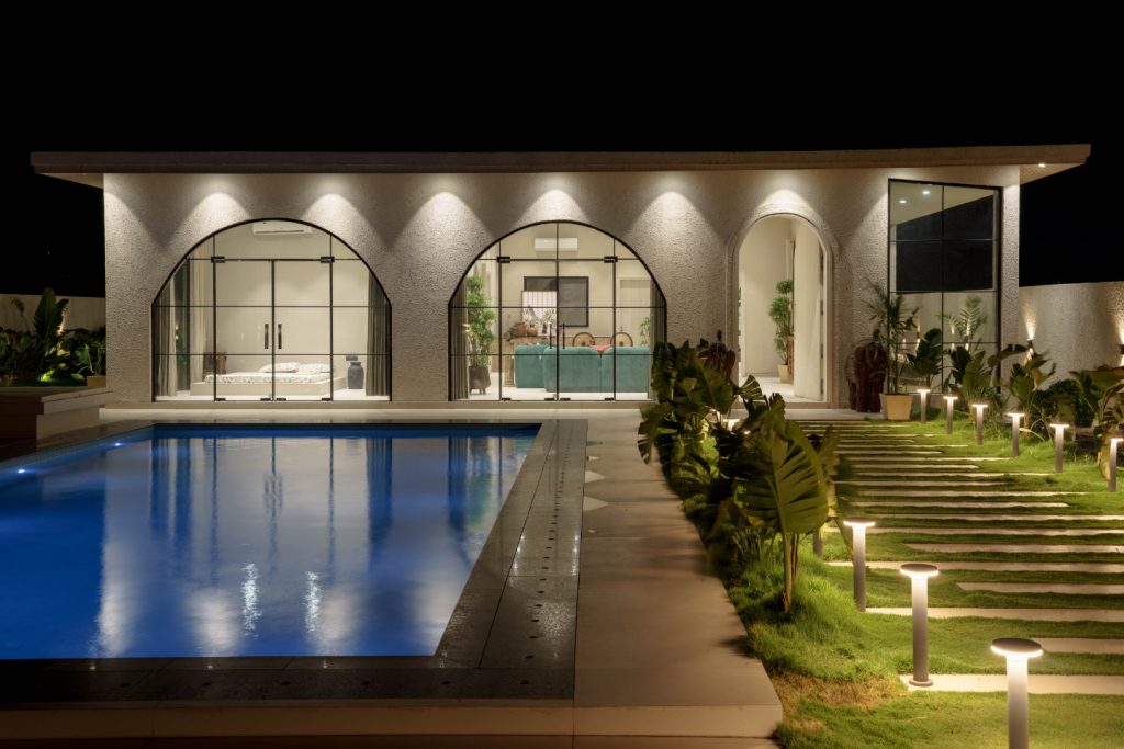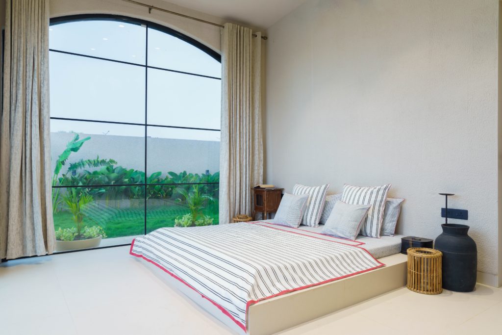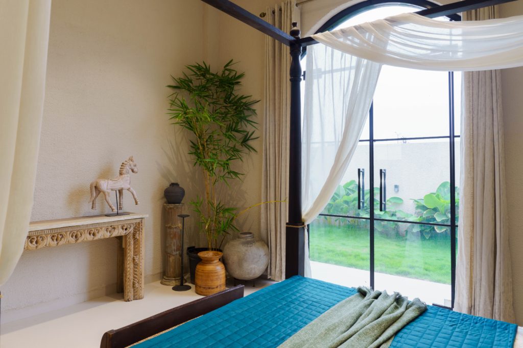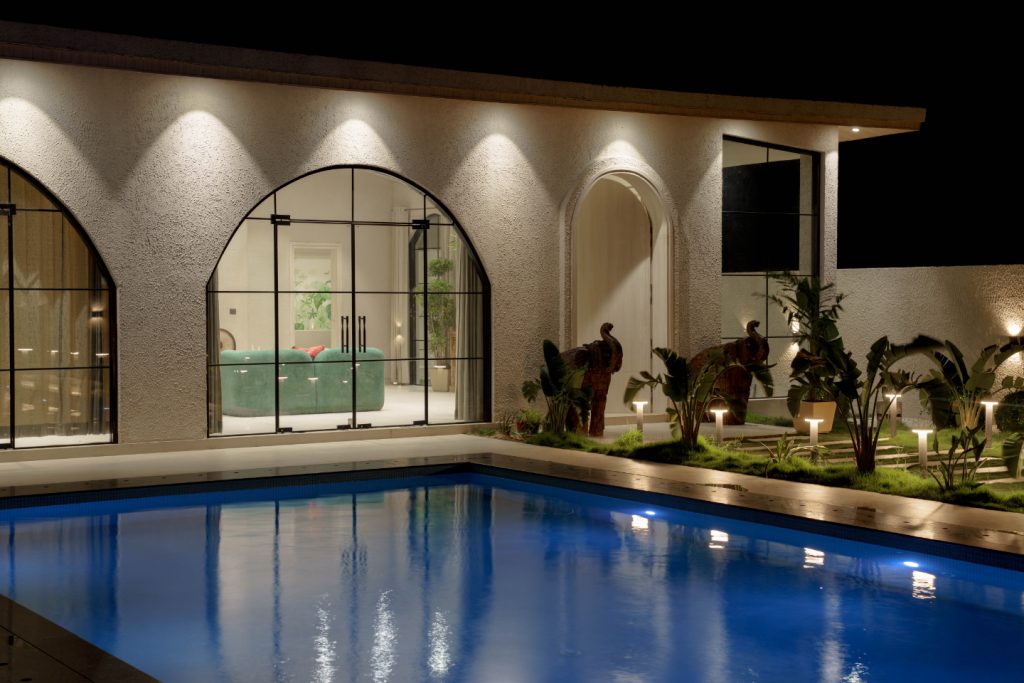 With a low-height bed facing a stunning pool and garden view, this room is a haven of tranquility. A vintage console adds rustic character, while a large arched window frames the poolside like a living artwork. It’s a bedroom designed to blur the line between indoors and outdoors, offering a soothing escape.