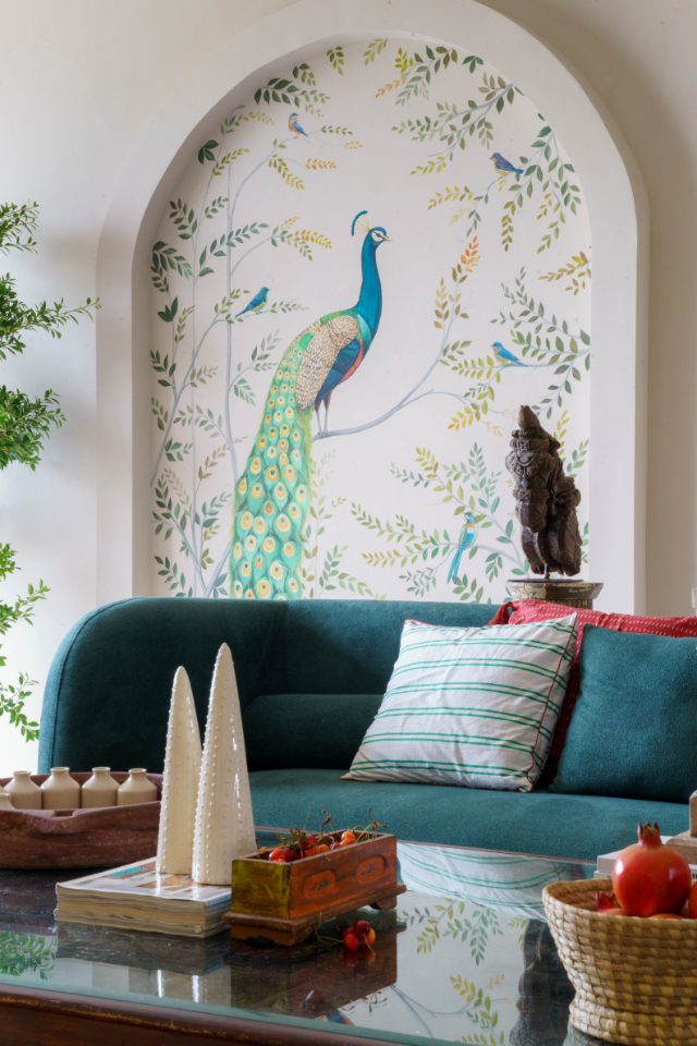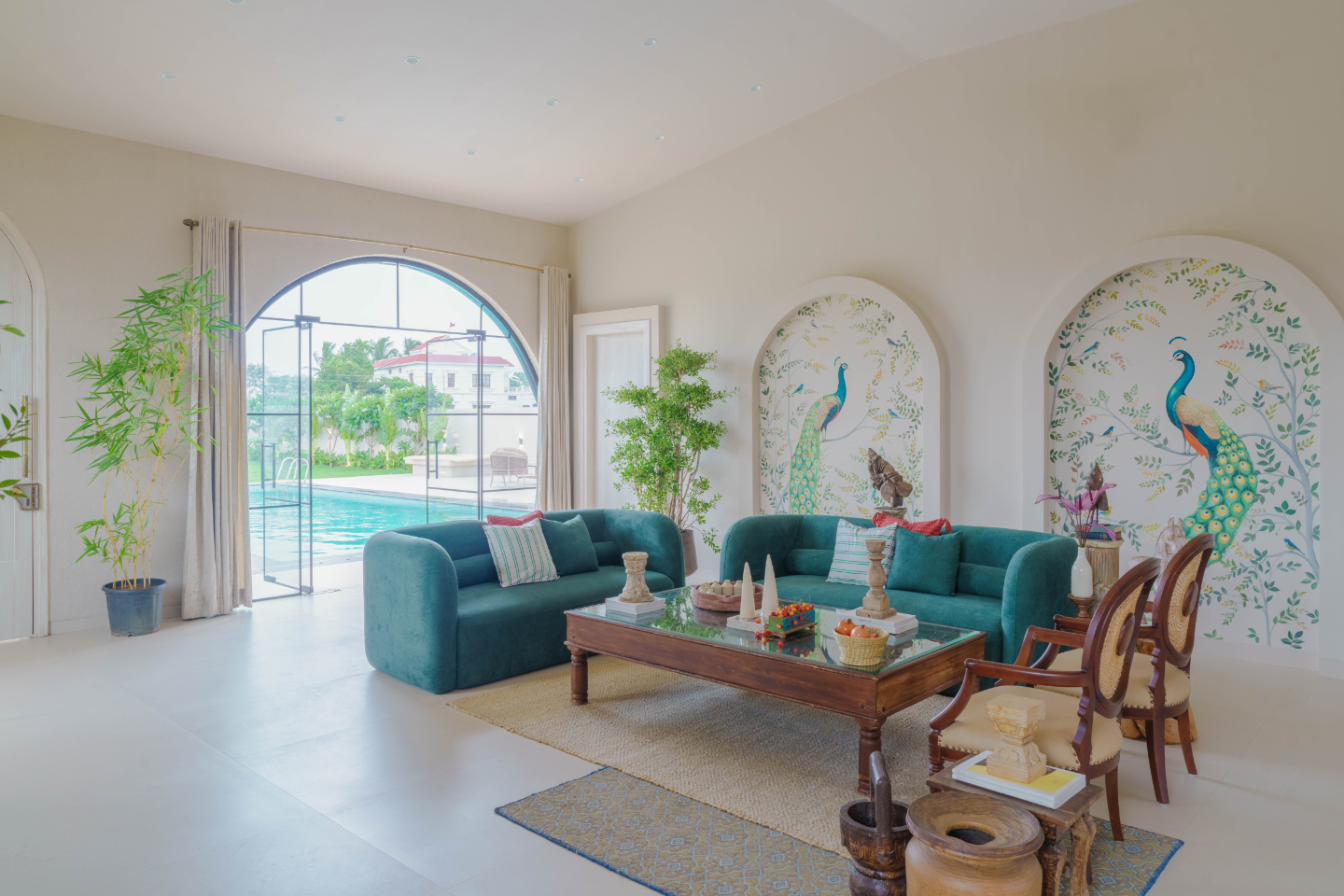 The back wall, adorned with flora and fauna-inspired artwork, adds a touch of whimsy and vibrancy. An arched entrance door and a large arched window opening to the pool complete the space, flooding it with light and connecting it to the lush outdoors.