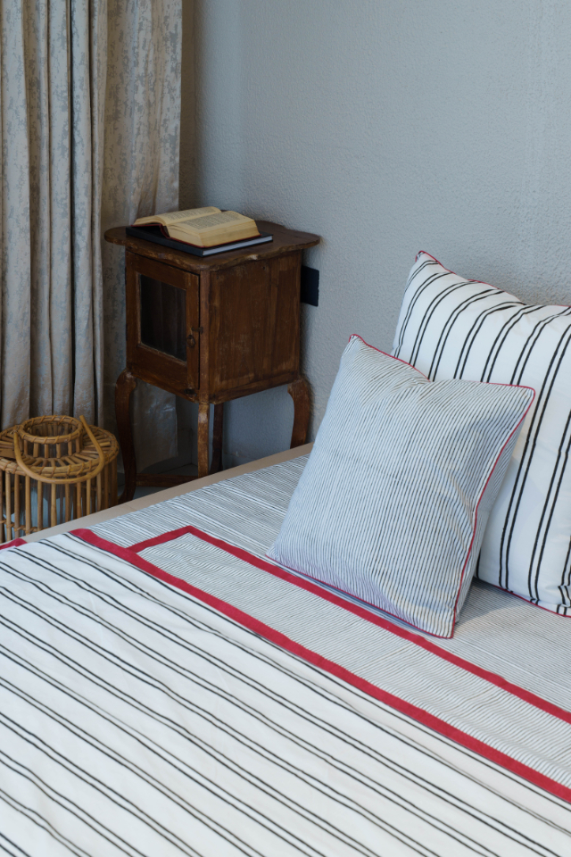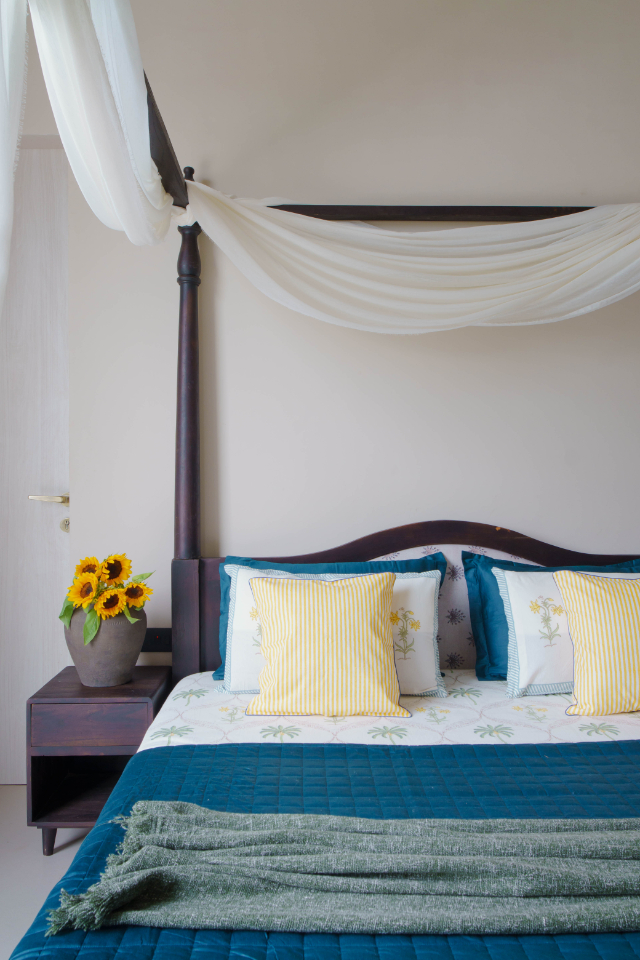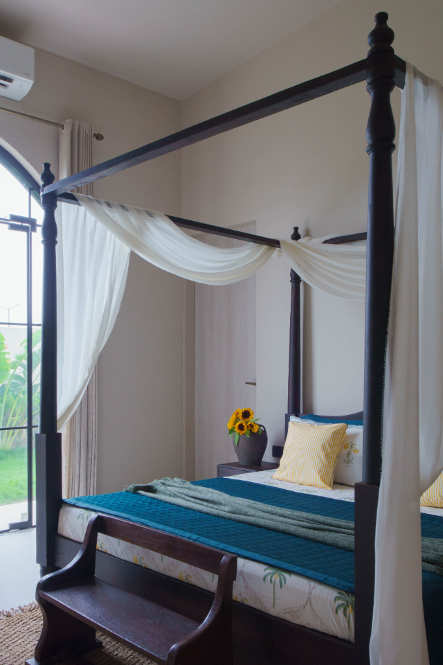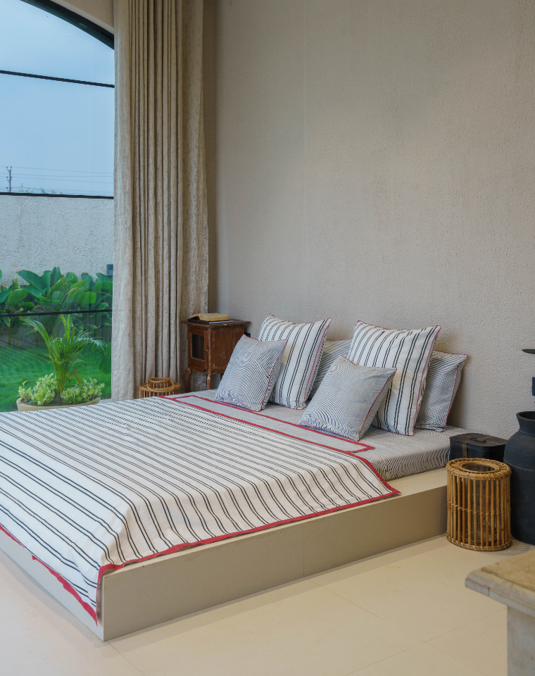 Here, simplicity and elegance intertwine. A low-height bed anchors the room with understated charm, while a large vintage mirror becomes the defining element, reflecting both light and beauty. The console, topped with handpicked artefacts, adds personality without overwhelming the space—making it a perfect blend of function and design.