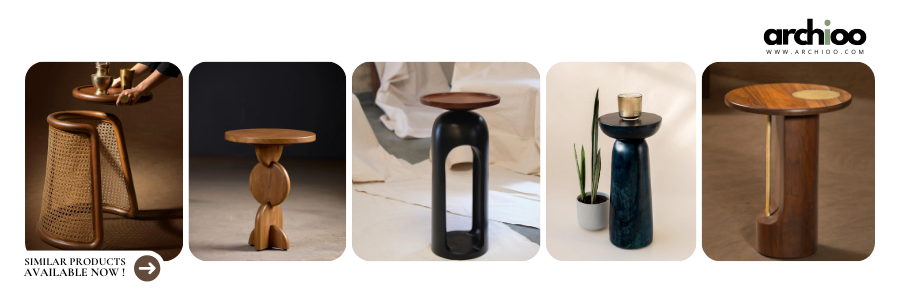 A cream-toned sectional anchors the seating area, complemented by sculptural furniture — particularly the asymmetrical wooden coffee table balancing on a spherical base, and the curving armchair upholstered in an earthy patterned fabric. These pieces give the space a collected, contemporary yet grounded character.