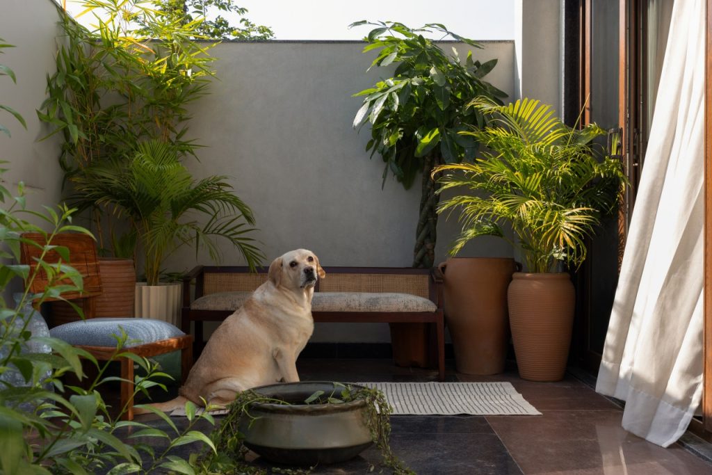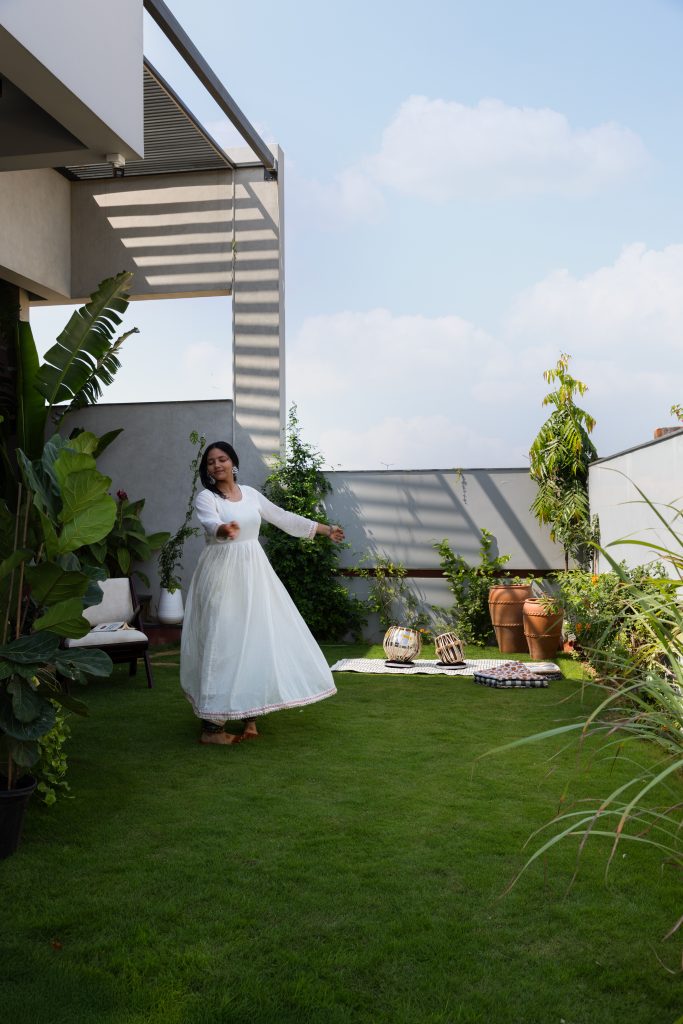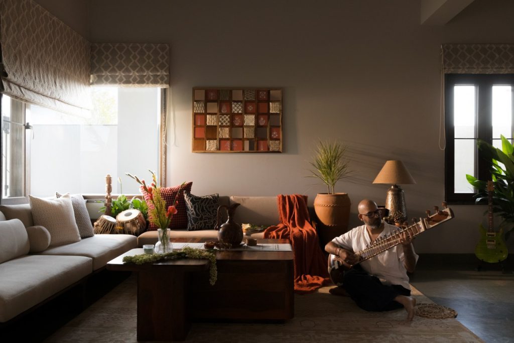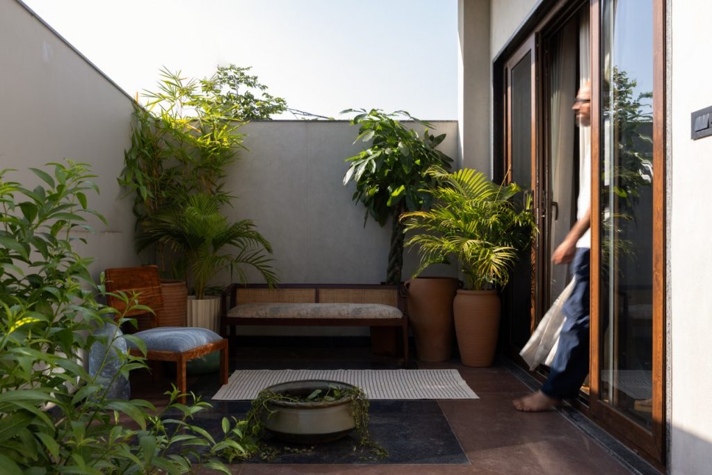 Beyond sliding glass doors, a private deck extends the room outward — framed by terracotta pots, bamboo, and palms. The deck carries the home’s musical spirit further; this is where riyaaz happens each morning, where sound meets silence.