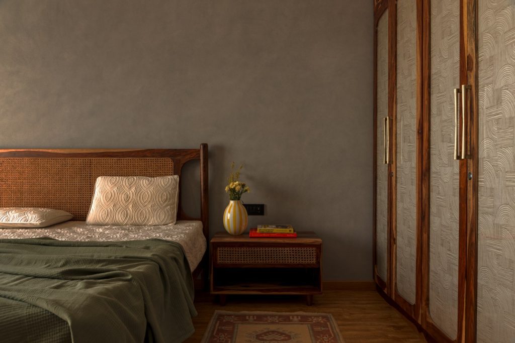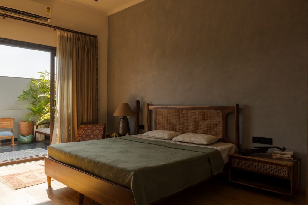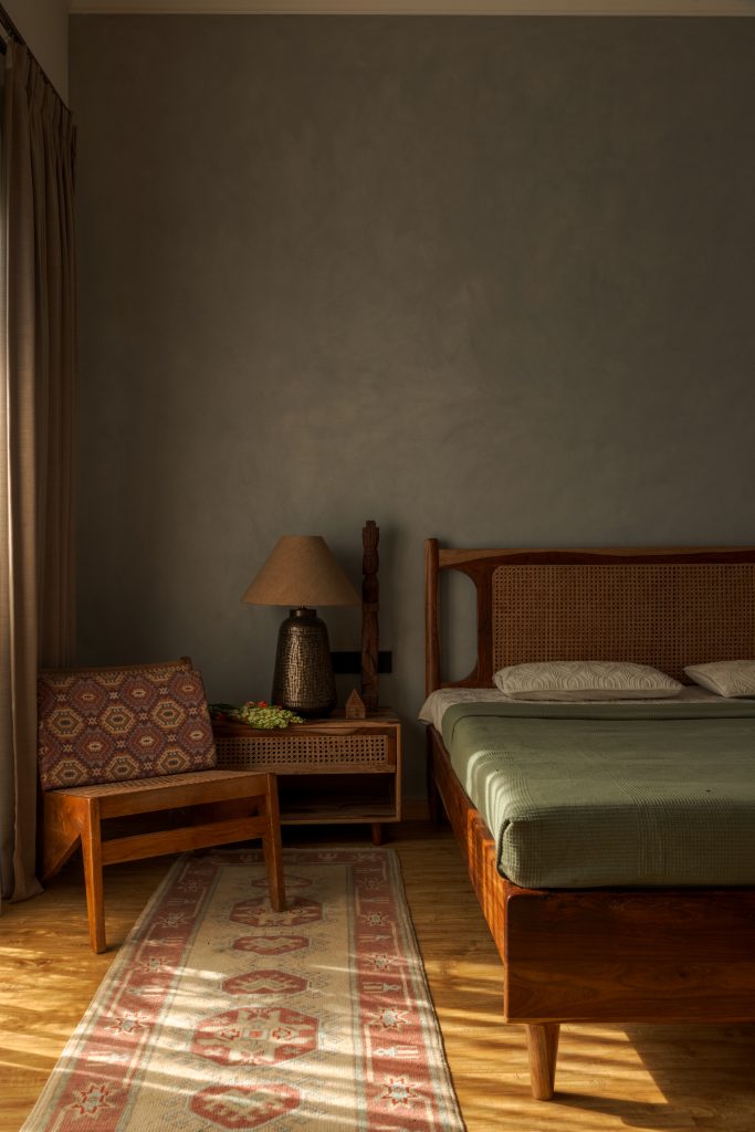 The primary bedroom becomes the most introspective space of the soulful retreat — a sanctuary layered in calm and texture. Lime-washed grey walls hold shifting light, while Sheesham and cane furniture by Furnicasa adds warmth and authenticity. The wardrobe, detailed with fabric sandwiched between glass, introduces a delicate transparency that softens the geometry of the space.