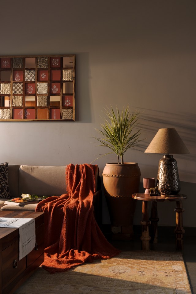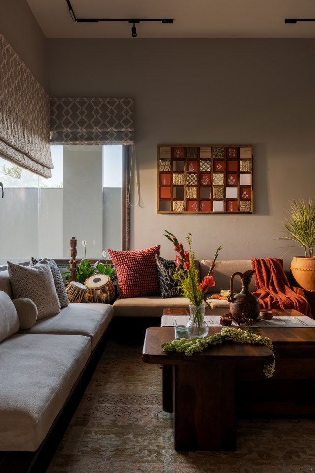 The living room unfolds as a serene, expressive space — imagined not as a formal lounge but as a backdrop for everyday moments. Sheesham and Babool wood furniture, paired with Jaipur Rugs and textured lime walls, create warmth and depth.