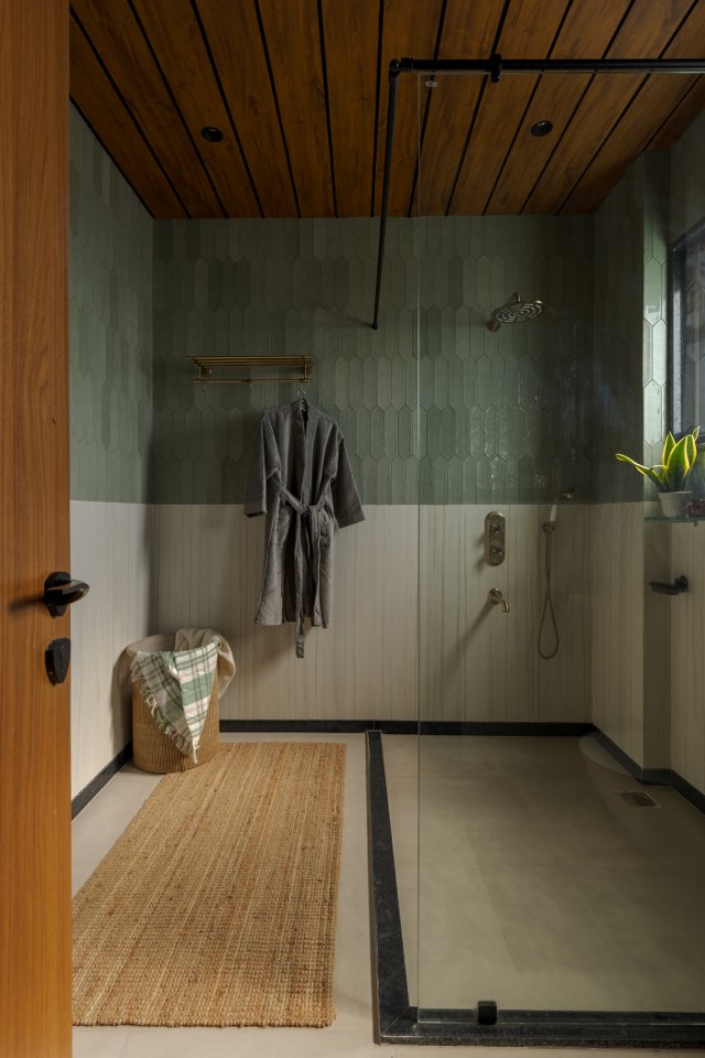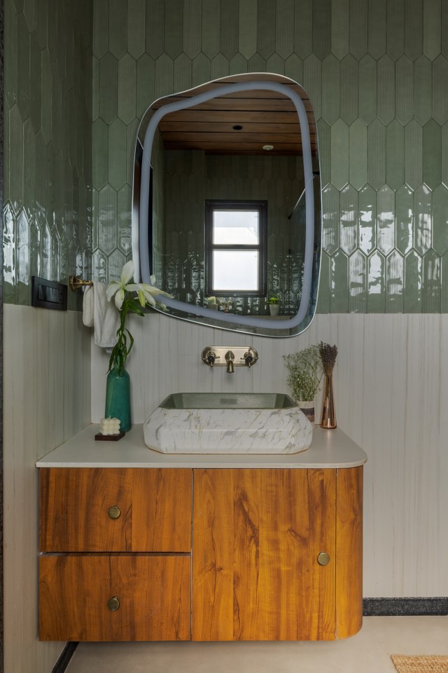 The ensuite bathroom interprets the home’s warmth with refinement. Vertical mint-green handmade tiles meet a teak-finish ceiling and brushed-brass fixtures. A stone basin on a curved wooden vanity becomes both function and sculpture. Every detail feels touched by hand — tactile, precise, and timeless.