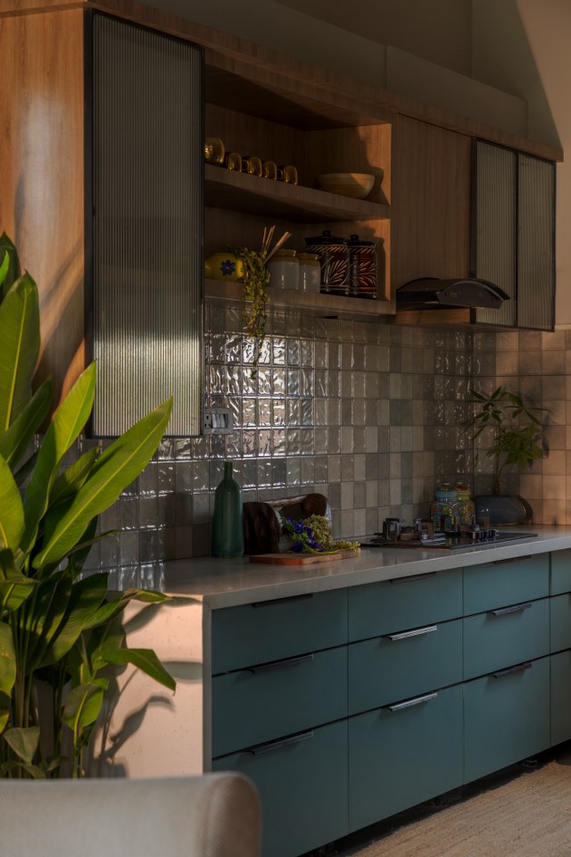 The kitchen continues this earthy narrative with a contemporary clarity. Sea-green cabinetry, wooden shelving, and handcrafted ceramic tiles form a tactile palette that balances freshness and function. Brass handles and soft daylight create gentle highlights against the muted tones, giving the space a calm, handcrafted character.