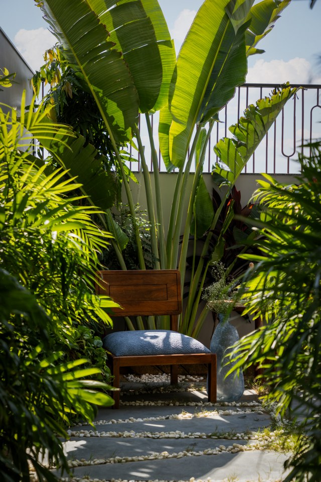 Planters and tropical greens soften the hard edges, turning the approach into an experience of stillness and welcome — a prelude to the home’s quiet, soulful rhythm.
